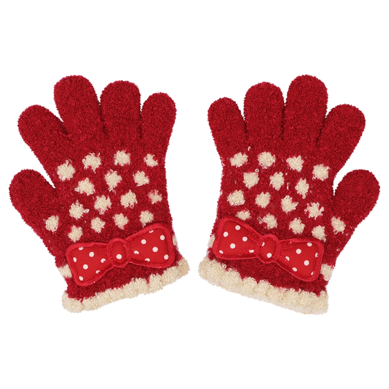かわいい水玉リボンの付いた水玉ジャガードの手袋。カラーはレッドでどんな格好にもマッチするカラーとなっております。毎年大変好評いただいている定番手袋でプレゼント用としてもおすすめで送られた相手は喜ぶこと間違いなし。