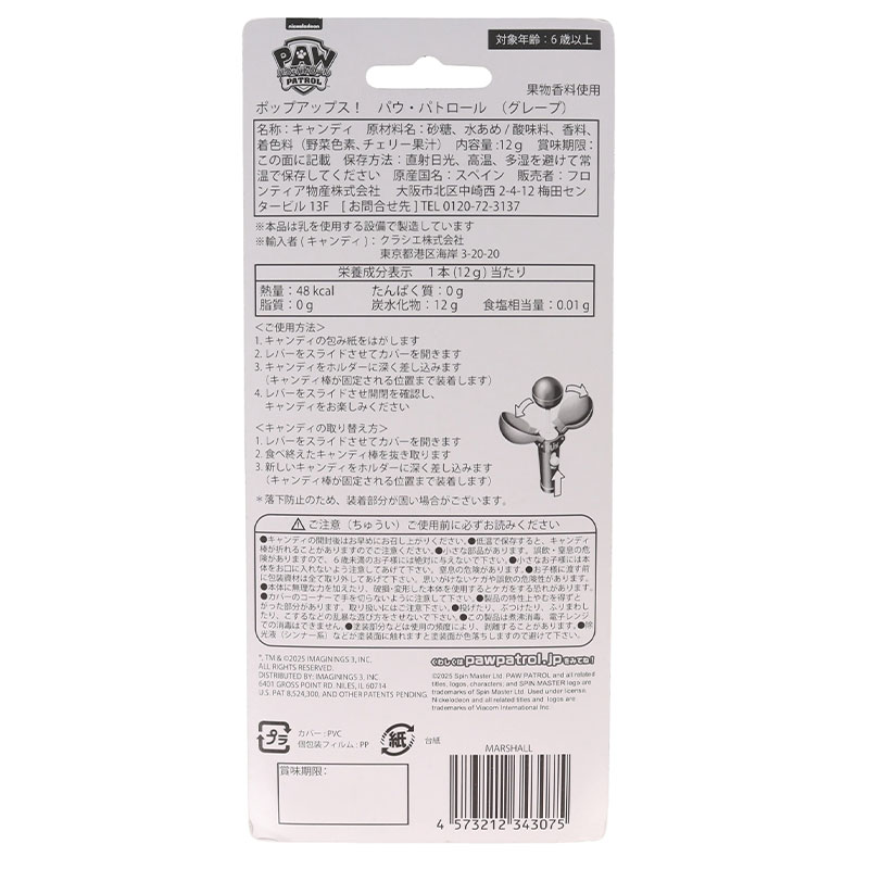 ●対象月齢:6歳~ ●商品サイズ:40×35×215mm ●重さ:50g ●内容量:12g ●グレープ味 ●原材料:砂糖、水あめ/酸味料、香料、着色料(野菜色素、チェリー果汁) ●栄養成分:1本(12g)当たり [熱量]48kcal [たんぱく質]0g [脂質]0g [炭水化物]12g [ナトリウム]-mg [食塩相当量]0.01g (c)2025 Spin Master Ltd. PAW PATROL and all related titles,logos,characters; and SPIN MASTER logo are trademarks,of Spin Master Ltd. Used under licence. Nickelodeon and all related titles and logos are trademarks of Viacom International Inc.