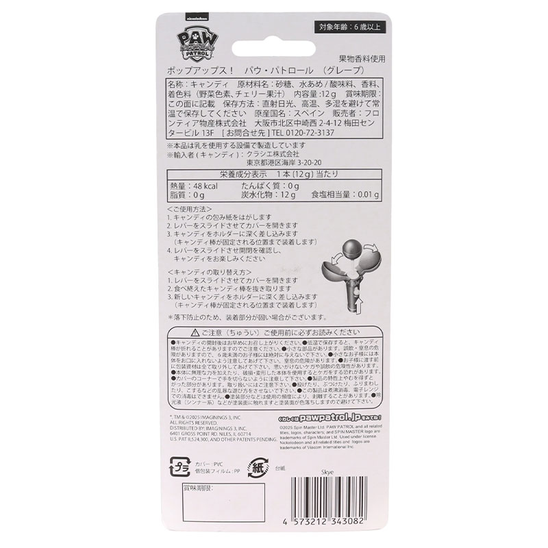 ●対象月齢:6歳~ ●商品サイズ:40×35×215mm ●重さ:50g ●内容量:12g ●グレープ味 ●原材料:砂糖、水あめ/酸味料、香料、着色料(野菜色素、チェリー果汁) ●栄養成分:1本(12g)当たり [熱量]48kcal [たんぱく質]0g [脂質]0g [炭水化物]12g [ナトリウム]-mg [食塩相当量]0.01g (c)2025 Spin Master Ltd. PAW PATROL and all related titles,logos,characters; and SPIN MASTER logo are trademarks,of Spin Master Ltd. Used under licence. Nickelodeon and all related titles and logos are trademarks of Viacom International Inc.