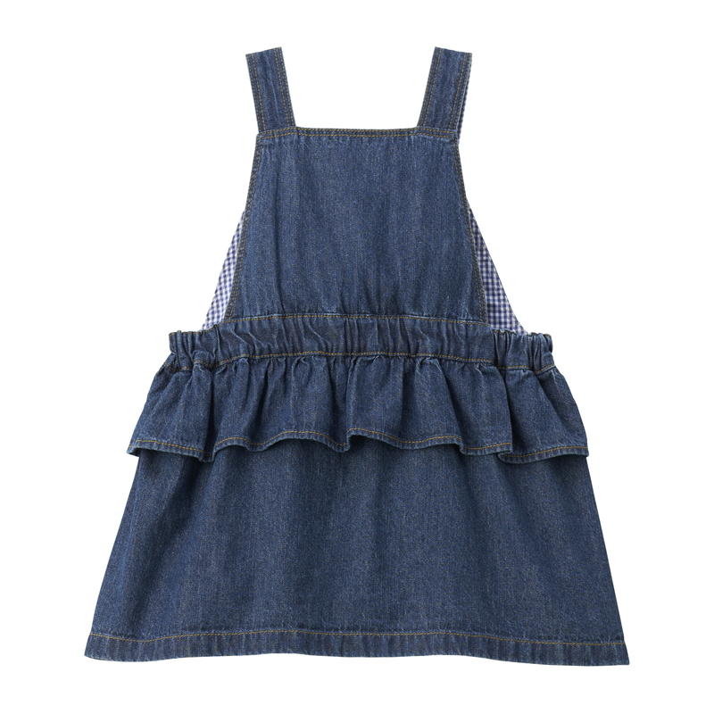 ●素材=[ジャンパースカート]6オンスデニム(格子部分)先染ギンガム[トレーナー]裏毛パイル ●品質=[ジャンパースカート]綿 100%、(格子部分)ポリエステル 95%、ポリウレタン 5%[トレーナー]綿 100%、(リブ部分) 綿 98%、ポリウレタン 2% ●原産国=中国