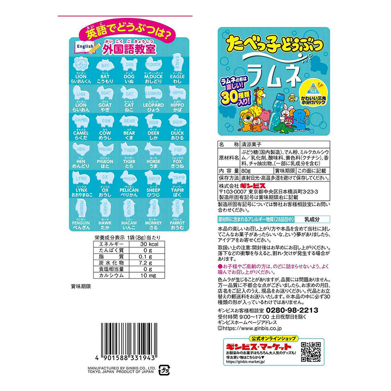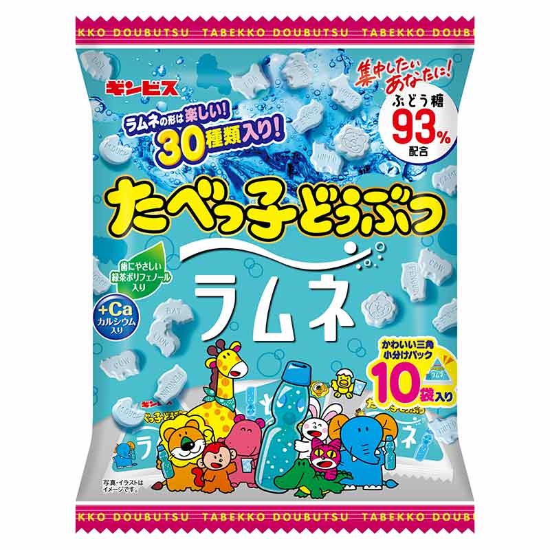 たべっ子どうぶつのビスケットと同じ形のどうぶつ型のラムネです。 ラムネの形は楽しい30種類。 ぶどう糖を93%配合。(含水結晶ぶどう糖を製造時93%配合しています。) しっかりとした噛み応えがあり、歯にやさしい緑茶ポリフェノールとカルシウム入り。 仕事や勉強、スポーツの合間など様々な場面で食べられます。