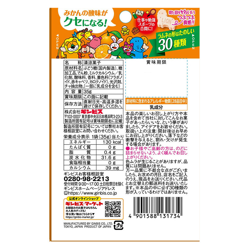 たべっ子どうぶつのビスケットと同じ形のどうぶつ型のラムネです。 みかんのさわやかな香りと酸味がクセになる味わいです。