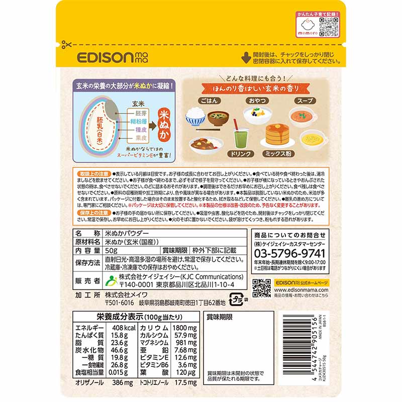 ●対象月齢:5ヵ月頃~ ●名称:米ぬかパウダー ●原材料:米ぬか(玄米(国産)) ●内容量:50g ●保存上の注意 ・お子様の手の届かない所に保存してください。 ・吸湿や虫害、酸化などを防ぐため、開封後はチャックをしっかり閉じて下さい。 ・常温で保存し、お早めにお召し上がりください。