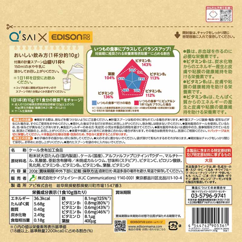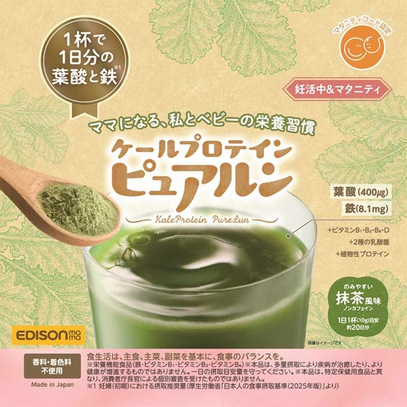 ●妊活中&マタニティに。 ・1杯で1日分の葉酸と鉄 ●サプリ×プロテイン×青汁のいいとこどり。 ・国産ケール100%使用。 ・植物由来のプロテイン+ケールで手軽に緑黄色野菜を摂取。 ●水や牛乳に溶かすだけで簡単栄養補給。 ●香料・着色料不使用