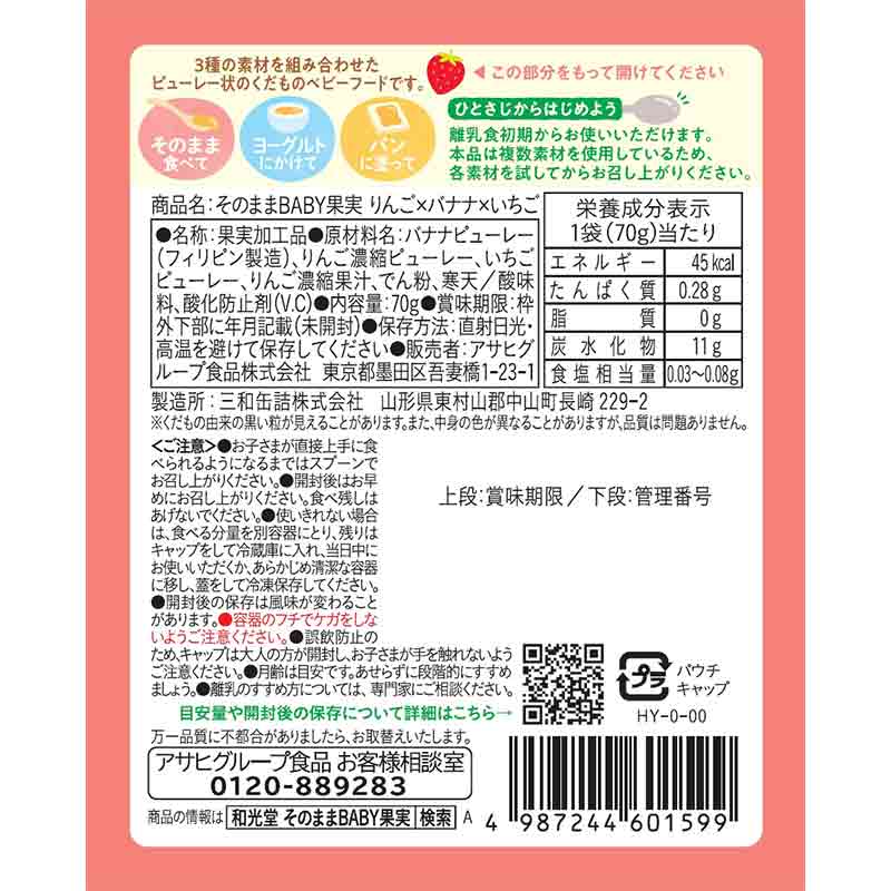 ●原材料名:バナナピューレー(フィリピン製造)、りんご濃縮ピューレー、いちごピューレー、りんご濃縮果汁、でん粉、寒天/酸味料、酸化防止剤(V.C) ●内容量:70g ●栄養成分表示:単位重量1袋(70g)当たり エネルギー:45kcal、たんぱく質:0.28g、脂質:0g、炭水化物:11g、食塩相当量:0.03~0.08g ●原材料に含まれるアレルギー物質(28品目中):バナナ、りんご ●使用開始月齢:スプーンで5か月頃から、直接食べで1歳頃から