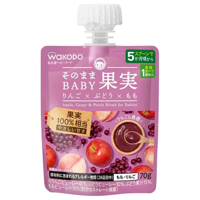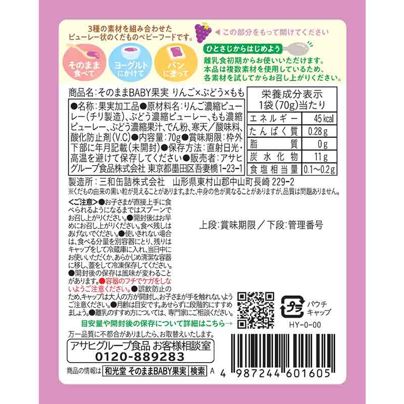 ●原材料名:りんご濃縮ピューレー(チリ製造)、ぶどう濃縮ピューレー、もも濃縮ピューレー、ぶどう濃縮果汁、でん粉、寒天/酸味料、酸化防止剤(V.C) ●内容量:70g ●栄養成分表示:単位重量1袋(70g)当たり エネルギー:45kcal、たんぱく質:0.28g、脂質:0g、炭水化物:11g、食塩相当量:0.1~0.2g ●原材料に含まれるアレルギー物質(28品目中):もも、りんご ●使用開始月齢:スプーンで5ヵ月頃から、直接食べで1歳頃から