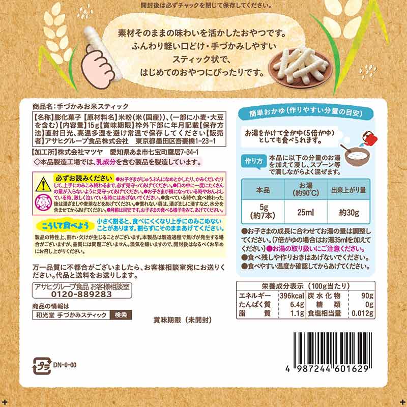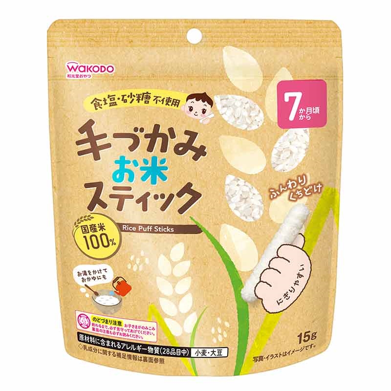 ●原材料名:米粉(米(国産))、(一部に小麦・大豆を含む) ●内容量:15g ●栄養成分表示:単位重量100g当たり エネルギー:396kcal、たんぱく質:6.4g、脂質:1.1g、炭水化物:90g、―糖類:0g、食塩相当量:0.012g ●原材料に含まれるアレルギー物質(28品目中):小麦、大豆 ●用開始月齢:7ヵ月頃から