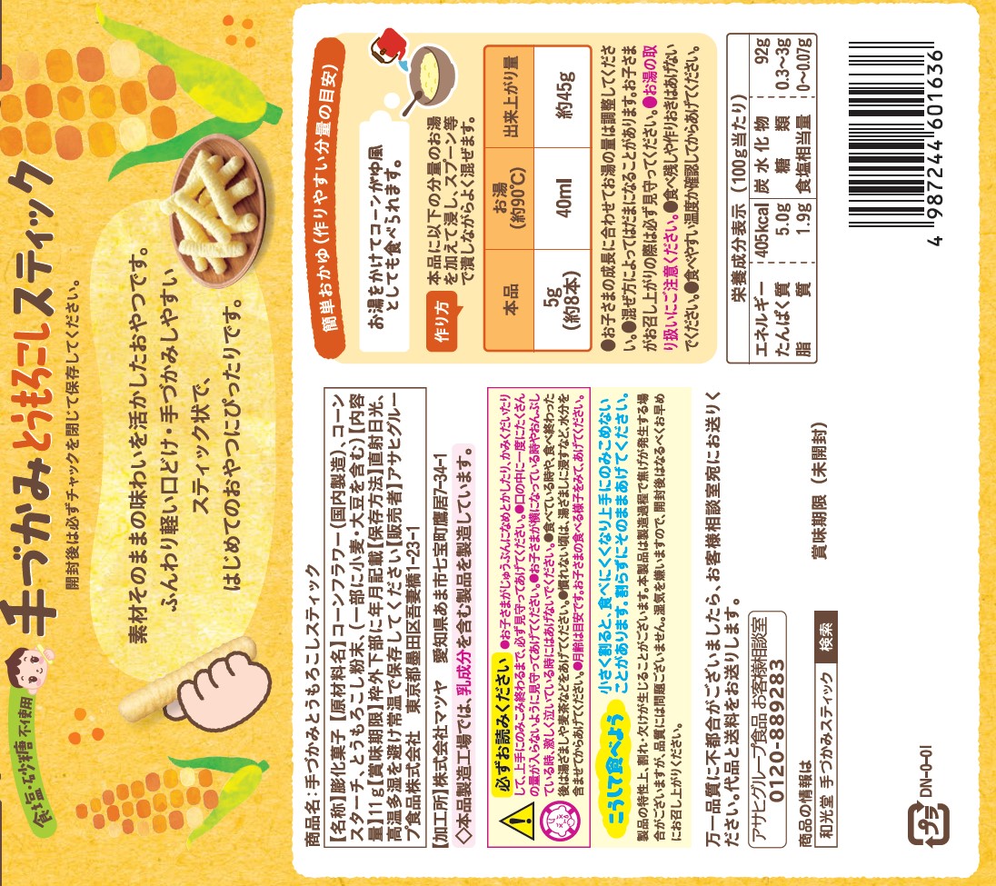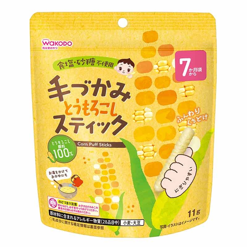 ●原材料名:コーンフラワー(国内製造)、コーンスターチ、とうもろこし粉末、(一部に小麦・大豆を含む) ●内容量:11g ●栄養成分表示:単位重量100g当たり エネルギー:405kcal、たんぱく質:5.0g、脂質:1.9g、炭水化物:92g、―糖類:0.3~3g、食塩相当量:0~0.07g ●原材料に含まれるアレルギー物質(28品目中):小麦、大豆 ●使用開始月齢:7ヵ月頃から
