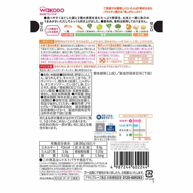 ●原材料名:野菜(にんじん、ほうれんそう、キャベツ、こまつな、ブロッコリー)、精白米(国産)、じゃがいも、オニオンソテー、たいほぐし身、たいエキス、食塩/増粘剤(加工でん粉)、ピロリン酸鉄 ●内容量:80g ●栄養成分表示:単位重量1袋(80g)当たり エネルギー:41kcal、たんぱく質:1.0g、脂質:0.14g、炭水化物:8.9g、食塩相当量:0.23g、鉄:1.5mg ●原材料にアレルギー物質(28品目中)は使用しておりません。 ●使用開始月齢:7ヵ月頃から