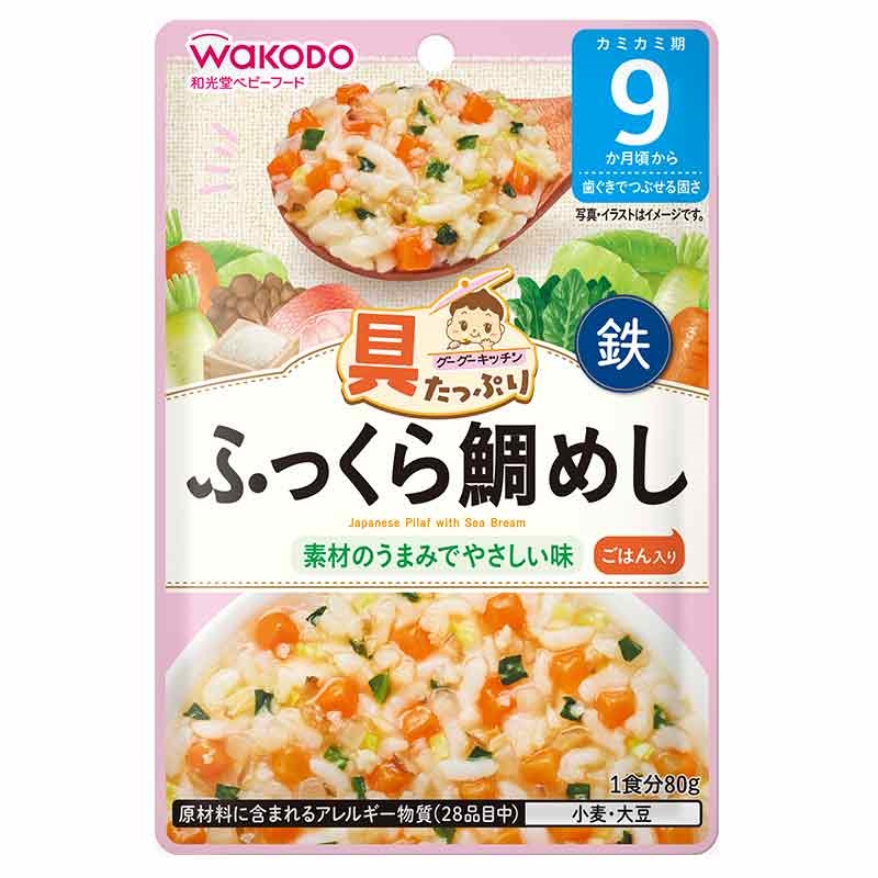 ●原材料名:野菜(にんじん、だいこん、キャベツ、ほうれんそう)、精白米(国産)、かつお昆布だし、たいほぐし身、まいたけ水煮、しょうゆ(小麦・大豆を含む)、砂糖、たいエキス、食塩、しょうがペースト/増粘剤(加工でん粉)、ピロリン酸鉄、クエン酸 ●内容量:80g ●栄養成分表示:単位重量1袋(80g)当たり エネルギー:42kcal、たんぱく質:1.1g、脂質:0.18g、炭水化物:8.9g、食塩相当量:0.26g、鉄:1.5mg ●原材料に含まれるアレルギー物質(28品目中):小麦、大豆 ●使用開始月齢:9ヵ月頃から
