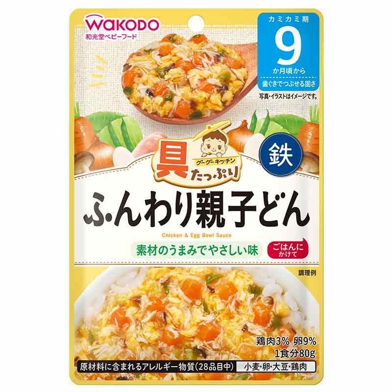 ●原材料名:野菜(にんじん(国産)、キャベツ、さやいんげん)、オニオンソテー、卵黄(卵を含む)、卵白、鶏ほぐし身、かつお昆布だし、砂糖、しいたけ水煮、しょうゆ(小麦・大豆を含む)、チキンエキス、食塩/増粘剤(加工でん粉)、クエン酸、ピロリン酸鉄 ●内容量:80g ●栄養成分表示:単位重量1袋(80g)当たり エネルギー:37kcal、たんぱく質:1.5~2.6g、脂質:1.1g、炭水化物:4.7g、食塩相当量:0.32g、鉄:1.5mg ●原材料に含まれるアレルギー物質(28品目中):小麦、卵、大豆、鶏肉 ●使用開始月齢:9ヵ月頃から