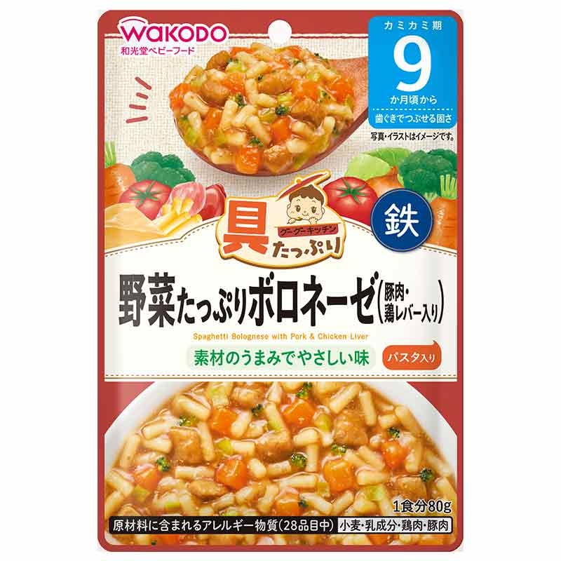●原材料名:野菜(にんじん(国産)、キャベツ、ブロッコリー)、オニオンソテー、スパゲッティ(小麦を含む)、豚肉加工品(豚肉、でん粉、食塩、海藻粉末)、トマトペースト、チキンエキス、香味野菜ソテー、鶏レバーペースト、ぶどう糖、チェダーチーズ、たまねぎペースト、食塩/増粘剤(加工でん粉)、ピロリン酸鉄 ・内容量:80g ・栄養成分表示:単位重量1袋(80g)当たり エネルギー:27~60kcal、たんぱく質:1.1~2.6g、脂質:0.3~2.0g、炭水化物:5.1~7.9g、食塩相当量:0.28g、鉄:1.5mg ・原材料に含まれるアレルギー物質(28品目中):小麦、乳、鶏肉、豚肉 ・使用開始月齢:9か月頃から