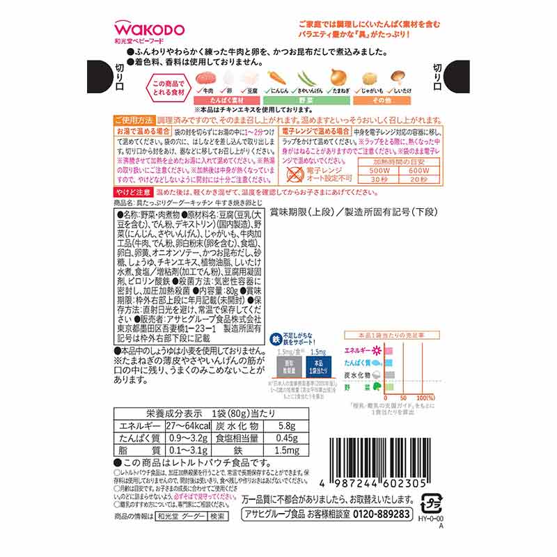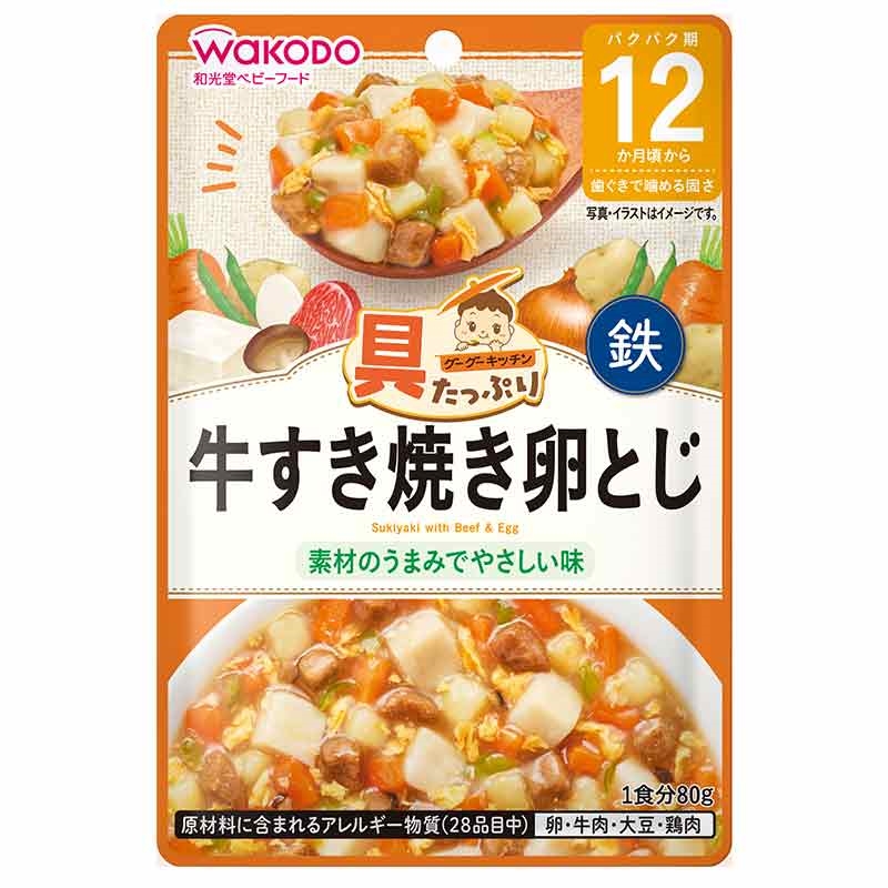●原材料名:豆腐(豆乳(大豆を含む)、でん粉、デキストリン)(国内製造)、野菜(にんじん、さやいんげん)、じゃがいも、牛肉加工品(牛肉、でん粉、卵白粉末(卵を含む)、食塩)、卵白、卵黄、オニオンソテー、かつお昆布だし、砂糖、しょうゆ、チキンエキス、植物油脂、しいたけ水煮、食塩/増粘剤(加工でん粉)、豆腐用凝固剤、ピロリン酸鉄 ●内容量:80g ●栄養成分表示:単位重量1袋(80g)当たり エネルギー:27~64kcal、たんぱく質:0.9~3.2g、脂質:0.1~3.1g、炭水化物:5.8g、食塩相当量:0.45g、鉄:1.5mg ●原材料に含まれるアレルギー物質(28品目中):卵、牛肉、大豆、鶏肉 ●使用開始月齢:12ヵ月頃から