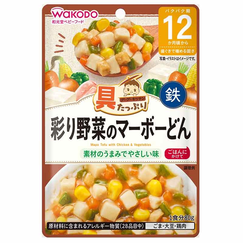 ・バラエティ豊かな『具』がたっぷり ・離乳食で不足しがちな鉄もしくはカルシウムを強化 ・ふんわりやわらかく練った鶏肉とコロコロに切った豆腐、赤・黄・緑の彩り野菜も一緒に煮込んだマーボーどんのもとです。 ・着色料、香料は使用しておりません。 ・アルミ平パウチ