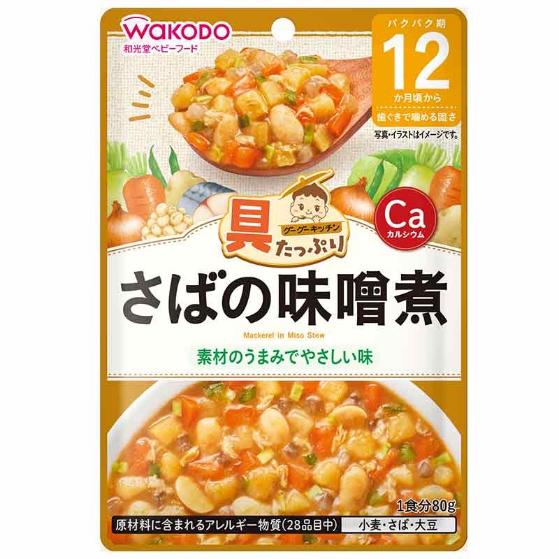 ●原材料名:野菜(にんじん(国産)、キャベツ、だいこん、さやいんげん)、じゃがいも、さばほぐし身、大豆、オニオンソテー、粉末みそ、砂糖、しょうゆ(小麦を含む)、しょうがペースト/増粘剤(加工でん粉)、炭酸カルシウム ●内容量:80g ●栄養成分表示:単位重量1袋(80g)当たり エネルギー:50kcal、たんぱく質:2.0~3.4g、脂質:1.2g、炭水化物:7.0g、食塩相当量:0.50g、カルシウム:100mg ●原材料に含まれるアレルギー物質(28品目中):小麦、さば、大豆 ●使用開始月齢:12ヵ月頃から