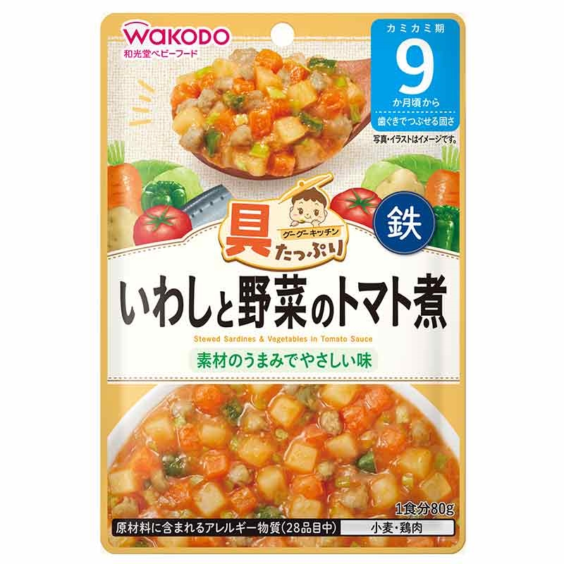 ●原材料名:じゃがいも(国産)、野菜(にんじん、キャベツ、ピーマン)、魚加工品(いわし、パン粉、小麦粉、たまねぎ、植物油脂、食塩)、トマトケチャップ、野菜ブイヨンペースト、トマトペースト、チキンエキス、砂糖、食塩/増粘剤(加工でん粉)、ピロリン酸鉄 ●内容量:80g ●栄養成分表示:単位重量1袋(80g)当たり エネルギー:40kcal、たんぱく質:0.96g、脂質:0.53g、炭水化物:7.8g、食塩相当量:0.35g、鉄:1.5mg ●原材料に含まれるアレルギー物質(28品目中):小麦、鶏肉 ●使用開始月齢:9ヵ月頃から