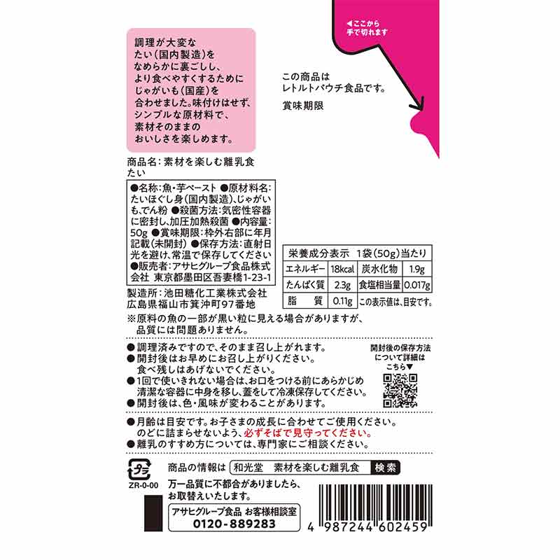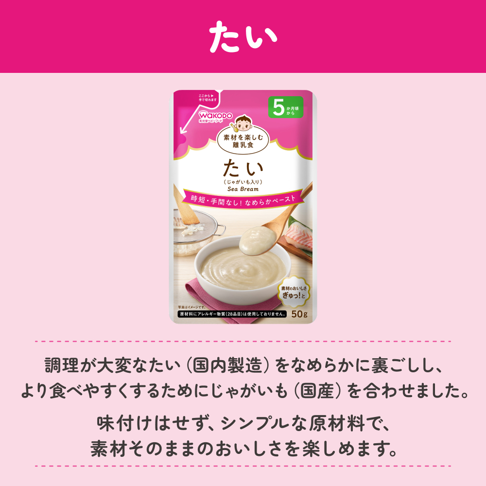 ・調理が大変なたい(国内製造)をなめらかに裏ごしし、より食べやすくするためにじゃがいも(国産)を合わせました。 ・味付けはせず、シンプルな原材料で、素材そのままのおいしさを楽しめます。 ・器に注ぎやすい注出口付きパウチ。小分け冷凍の際にも便利。 ・時短・手間なし、なめらかペースト。