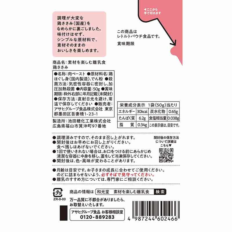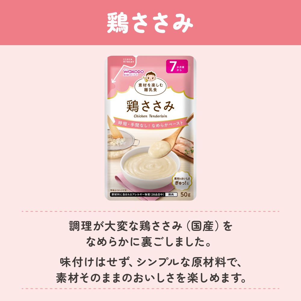 ・調理が大変な鶏ささみ(国産)をなめらかに裏ごしました。 ・味付けはせず、シンプルな原材料で、素材そのままのおいしさを楽しめます。 ・器に注ぎやすい注出口付きパウチ。小分け冷凍の際にも便利。 ・時短・手間なし、なめらかペースト。