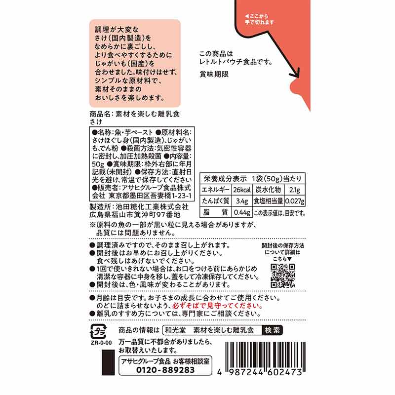 ●原材料名:さけほぐし身(国内製造)、じゃがいも、でん粉 ●内容量:50g ●栄養成分表示:単位重量1袋(50g)当たり エネルギー:26kcal、たんぱく質:3.4g、脂質:0.44g、炭水化物:2.1g、食塩相当量:0.027g この表示値は、目安です。 ●原材料に含まれるアレルギー物質(28品目中):さけ ●使用開始月齢:7ヵ月頃から