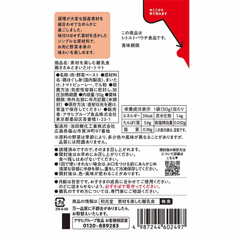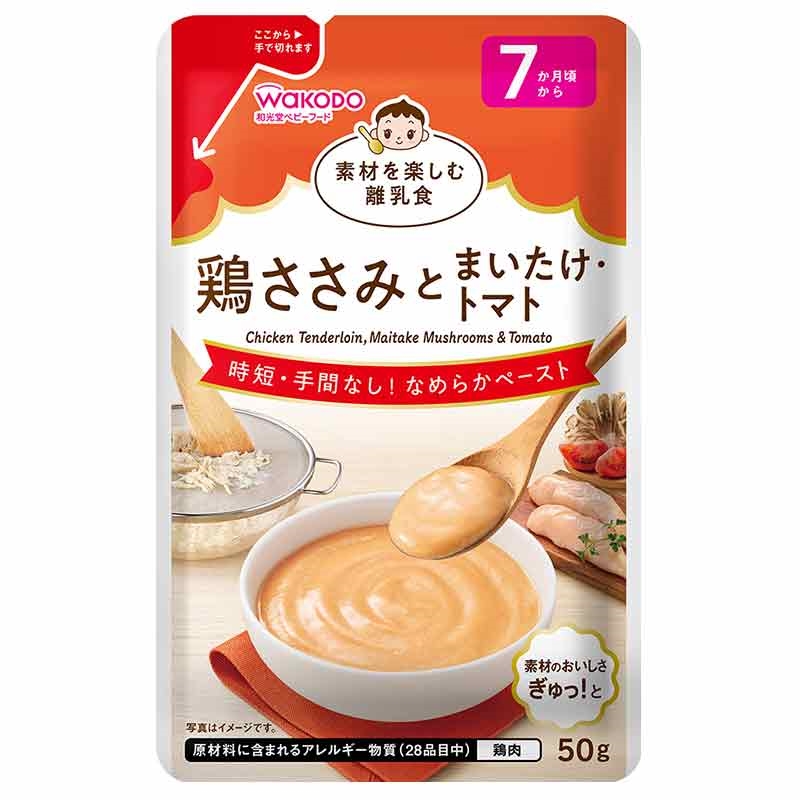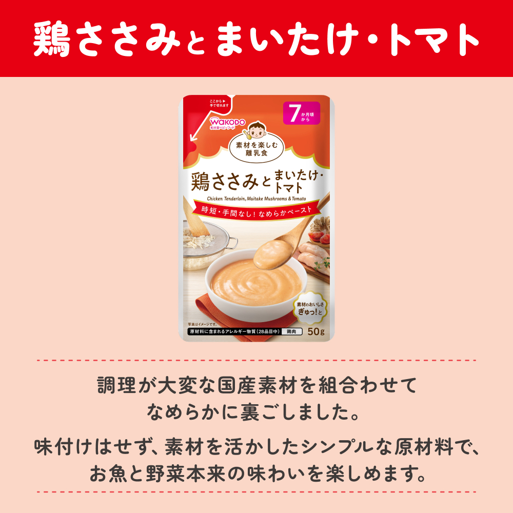 ●原材料名:鶏ほぐし身(国内製造)、まいたけ、トマトピューレー、でん粉 ●内容量:50g ●栄養成分表示:単位重量1袋(50g)当たり エネルギー:31kcal、たんぱく質:5.6g、脂質:0.36g、炭水化物:1.4g、食塩相当量:0.032g この表示値は、目安です。 ●原材料に含まれるアレルギー物質(28品目中):鶏肉 ●使用開始月齢:7ヵ月頃から