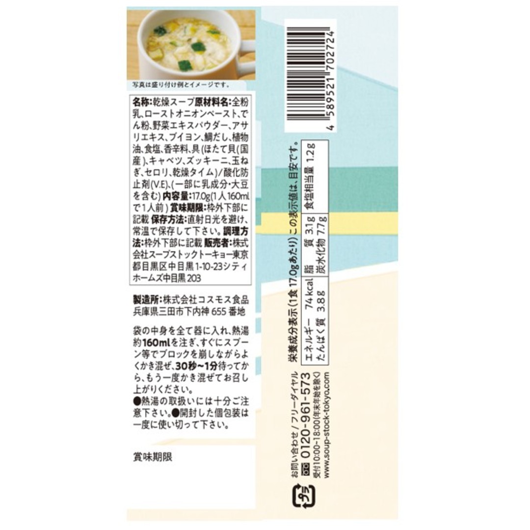 ●乾燥スープ ●原材料名:全粉乳、ローストオニオンペースト、でん粉、野菜エキスパウダー、アサリエキス、ブイヨン、鯛だし、植物油、食塩、香辛料、具(ほたて貝(国産)、キャベツ、ズッキーニ、玉ねぎ、セロリ、乾燥タイム)/酸化防止剤(V.E)、(一部に乳成分・大豆を含む) ●内容量:17.0g(1人160mlで1人前) ●栄養成分:その他 熱量 74kcal たんぱく質 3.8g 脂質 3.1g 炭水化物 7.7g 食塩相当量 1.2g