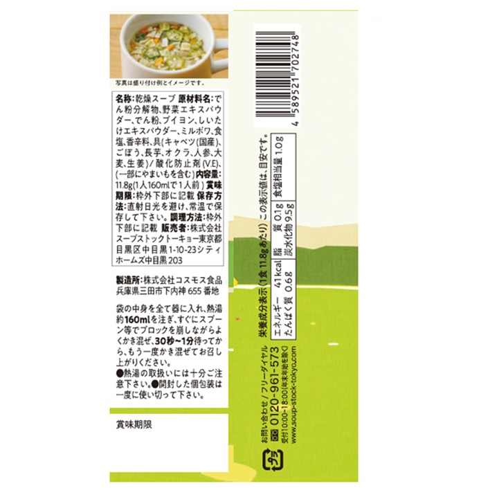 ●乾燥スープ ●原材料名:でん粉分解物、野菜エキスパウダー、でん粉、ブイヨン、しいたけエキスパウダー、ミルポワ、食塩、香辛料、具(キャベツ(国産)、ごぼう、長芋、オクラ、人参、大麦、生姜)/酸化防止剤(V.E)、(一部にやまいもを含む) ●内容量:11.8g(1人160mlで1人前) ●栄養成分:その他 熱量 41kcal たんぱく質 0.6g 脂質 0.1g 炭水化物 9.5g 食塩相当量 1.0g