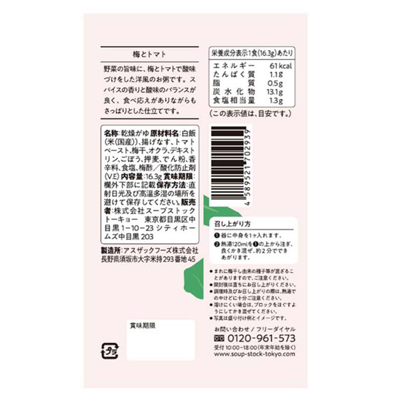 ●乾燥がゆ ●原材料名:白飯(米(国産))、揚げなす、トマトペースト、梅干、オクラ、デキストリン、ごぼう、押麦、でん粉、香辛料、食塩、梅酢/酸化防止剤(V.E) ●内容量:16.3g ●栄養成分:その他 熱量 61kcal たんぱく質 1.1g 脂質 0.5g 炭水化物 13.1g 食塩相当量 1.3g
