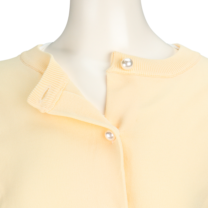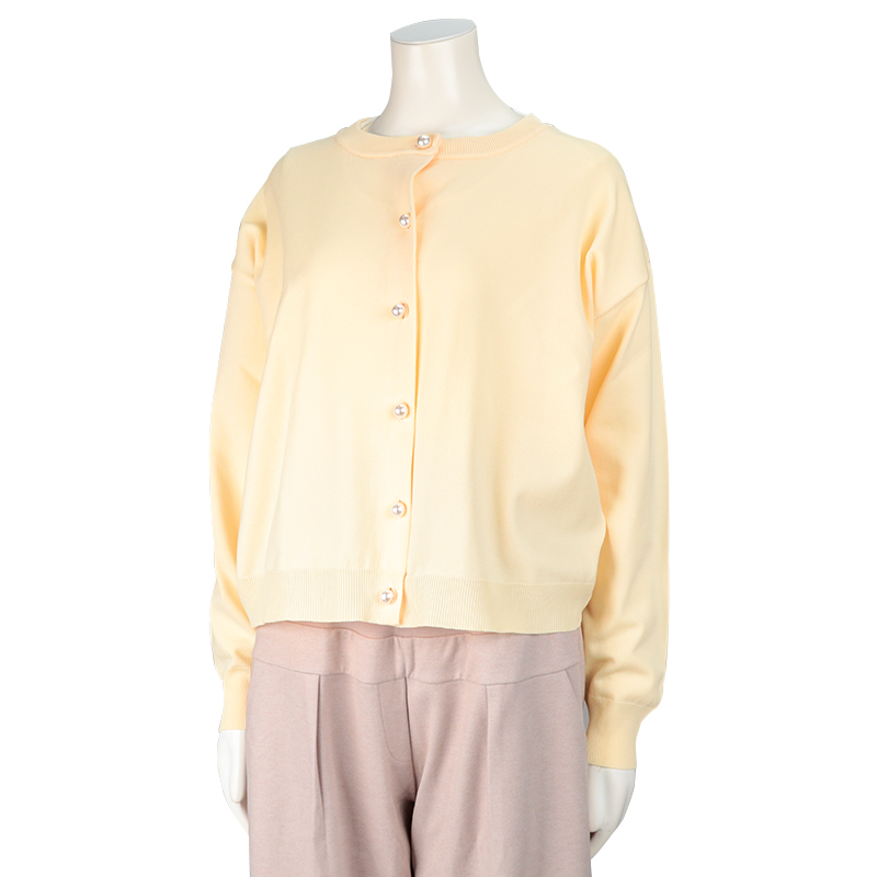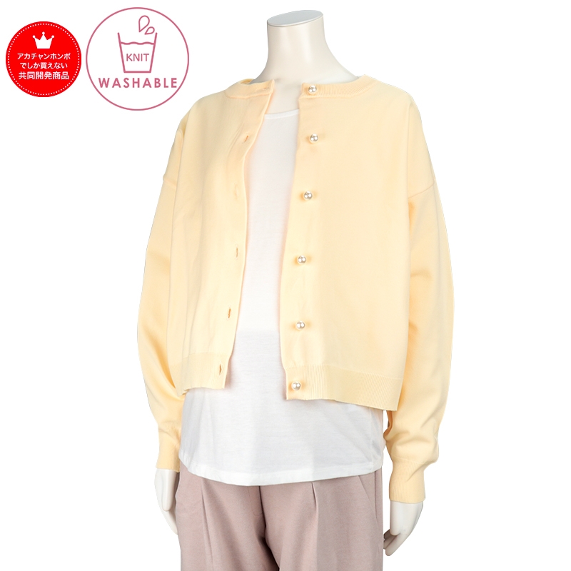 単品力のあるカーディガンアンサンブル。 季節感を問わないポリエステルの糸で軽く仕上げたカーディガンは様々なアイテムのプラスワンアイテムとして重宝します。 インナーのロンTは授乳口をなくし、前身裾のカーブを深くとり裾巾を少しAラインにしてめくりあげしやすくしています。 カーディガンにトレンド感のあるパール風釦をつけて、いろいろなスタイリングにプラスして頂けます。