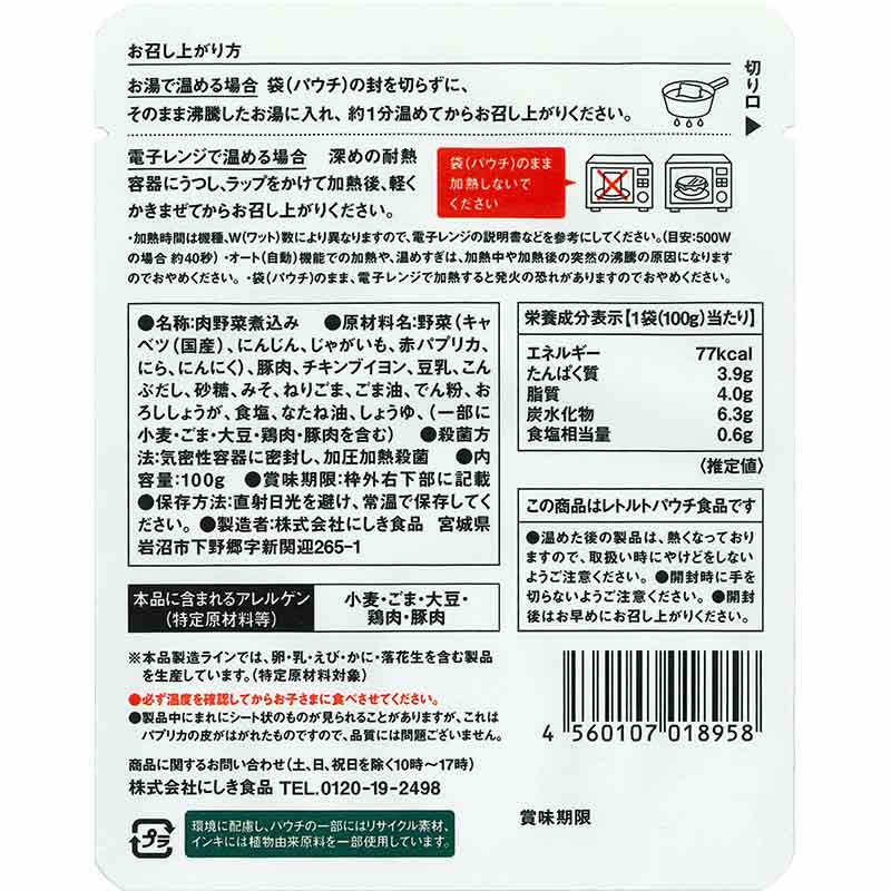 鍋料理を一人分取り分けたイメージで、国産の豚ひき肉と5種類の野菜を使用し、豆乳やみそ、ねりごまなどを加えた、コクのあるまろやかなスープで煮込みました。 おかずとしてはもちろん、ごはんや麺にかけたりとお好みにあわせてお召し上がりください。 管理栄養士監修