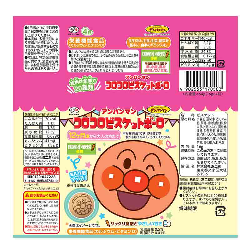 ●対象月齢:12ヵ月~ ●内容量:64g ●原材料:小麦粉(国内製造)、でん粉、砂糖、植物油脂、卵、粉末状小麦たん白、異性化液糖、脱脂粉乳、食塩、牛乳/貝カルシウム、膨脹剤、香料(卵・乳由来)、カラメル色素、乳化剤、V.E、V.D