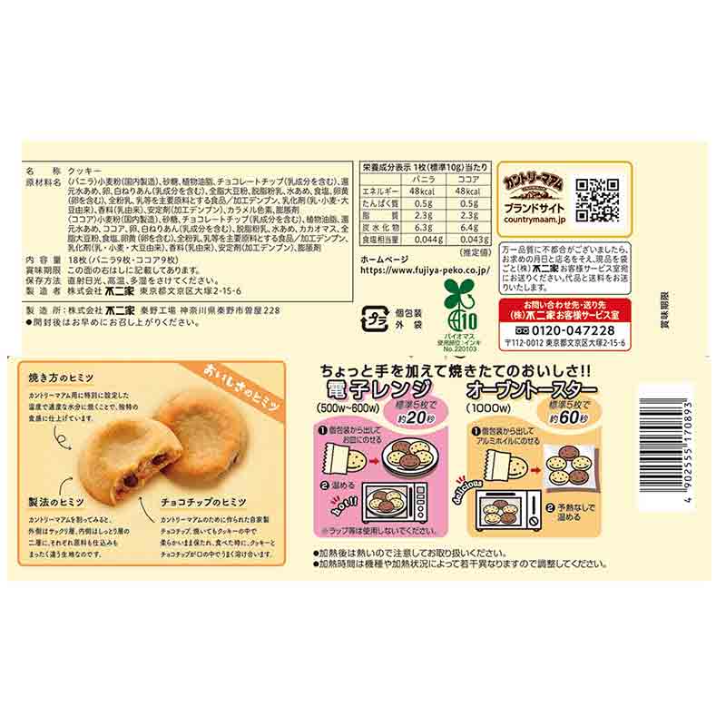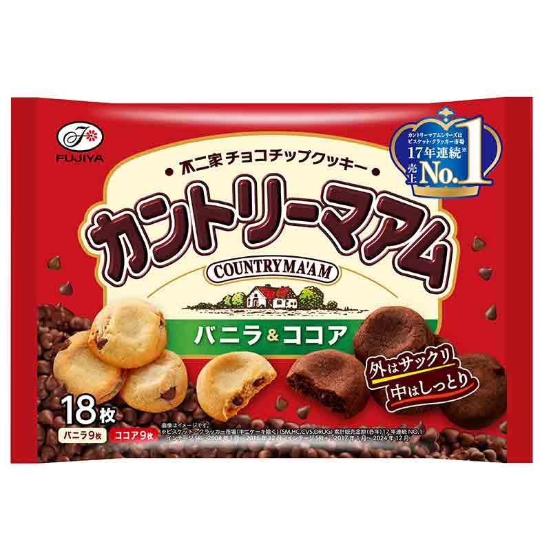 ●内容量:18枚 ●原材料: <バニラ>小麦粉(国内製造)、砂糖、植物油脂、チョコレートチップ(乳成分を含む)、還元水あめ、卵、白ねりあん(乳成分を含む)、全脂大豆粉、脱脂粉乳、水あめ、食塩、卵黄(卵を含む)、全粉乳、乳等を主要原料とする食品/加工デンプン、乳化剤(乳・小麦・大豆由来)、香料(乳由来)、安定剤(加工デンプン)、カラメル色素、膨脹剤 <ココア>小麦粉(国内製造)、砂糖、チョコレートチップ(乳成分を含む)、植物油脂、還元水あめ、ココア、卵、白ねりあん(乳成分を含む)、脱脂粉乳、水あめ、カカオマス、全脂大豆粉、食塩、卵黄(卵を含む)、全粉乳、乳等を主要原料とする食品/加工デンプン、乳化剤(乳・小麦・大豆由来)、香料(乳由来)、安定剤(加工デンプン)、膨脹剤