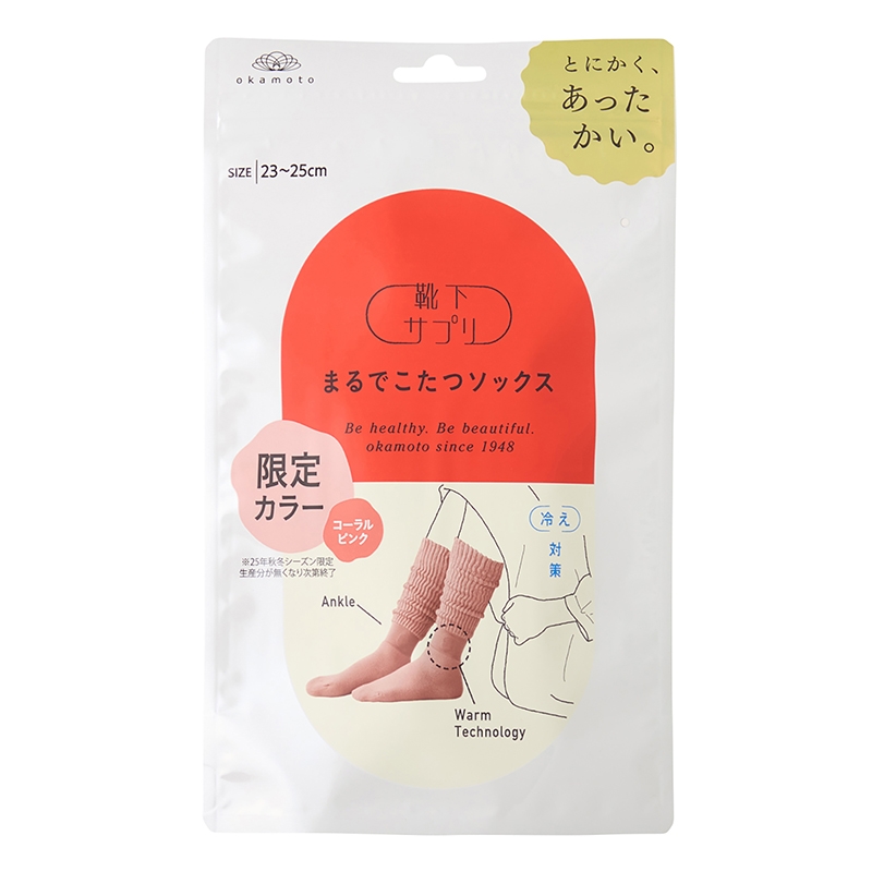 独自の編み方により、足首のツボである三陰交を温めます。 さらに、岡本独自開発の特殊保温・発熱素材を使用し今までより温かい靴下を実現しました。 リラックスしたいとき、お休み中に足が冷えるとき、冷えたフローリングが辛いときなどに冷え対策ができます。