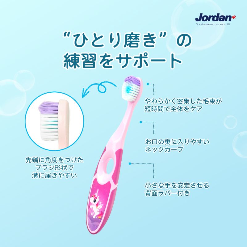 ※色/絵柄はお選びいただけません。 複数本ご購入の場合、色/絵柄が重複することがございます。予めご了承ください。 ステップ2は、お子様の小さな乳歯を磨くために作られた歯ブラシです。 お子様の歯と歯茎をやさしく磨くためのとても柔らかなブラシです。 ブラシ先端の毛が長いため、奥歯までしっかり磨けます。 デュアルグリップを採用し、中心部に丸みを持たせることで、仕上げ磨きの大人も握りやすく、 お子様が自分で歯ブラシを持ちやすいデザインに仕上げています。