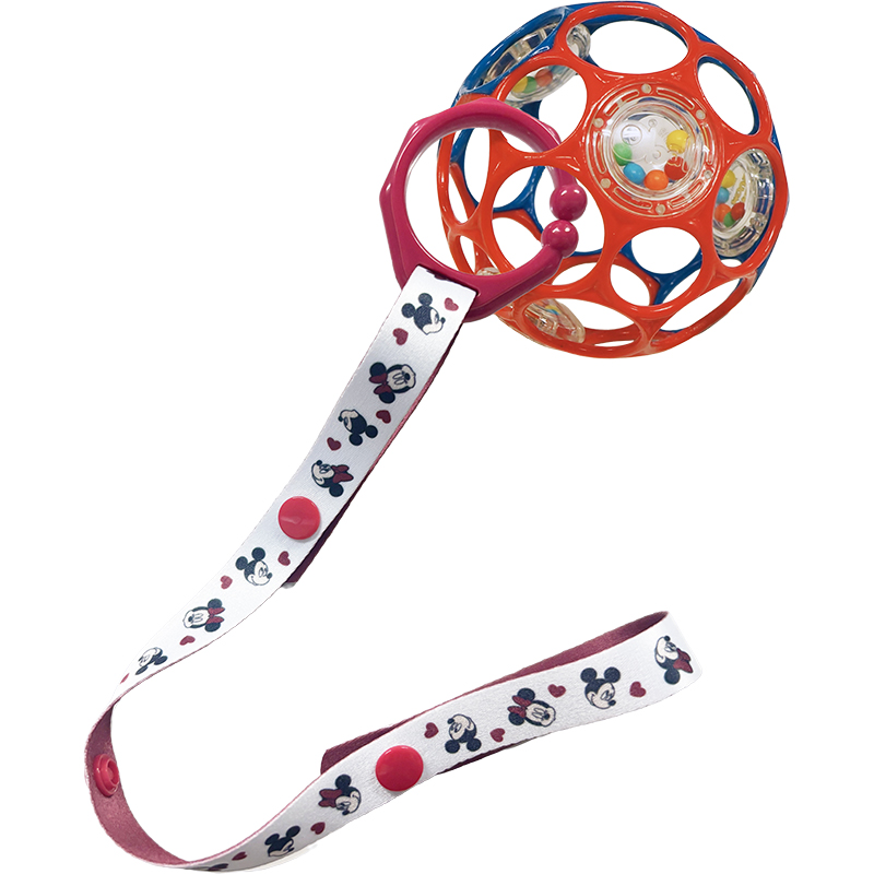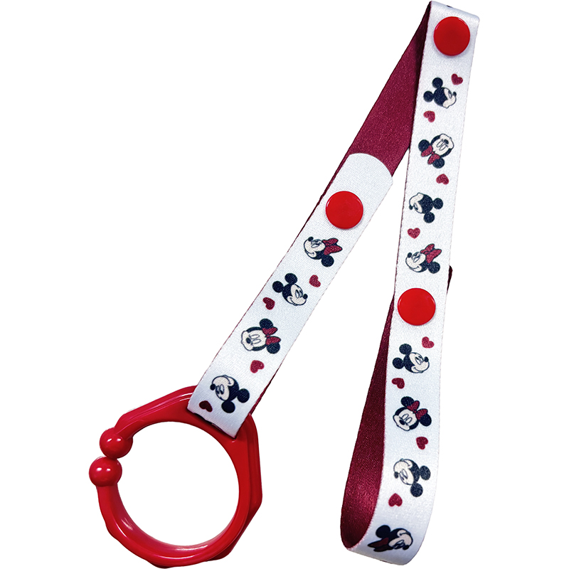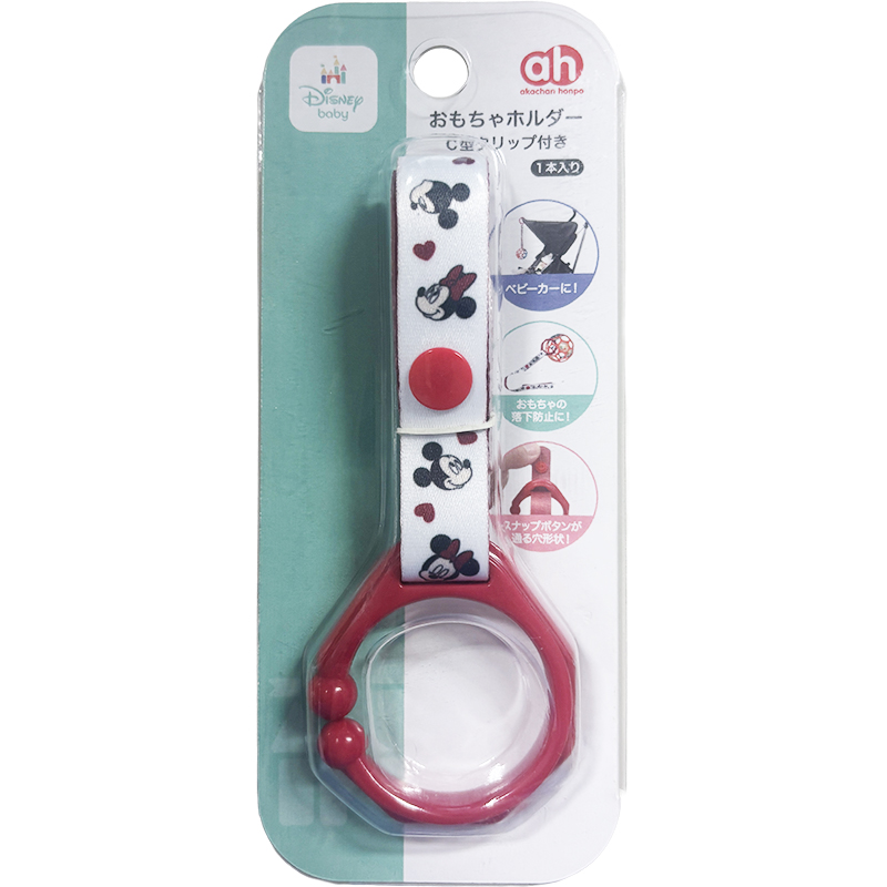 お気に入りのおもちゃの落下防止に! 大切なおもちゃを投げてなくさないようにするホルダーです。 スナップボタンでベビーカーや抱っこ紐などに簡単に取り付けられ、 C型クリップでベビーカーの幌にも取り付けられます。 かわいいくまのミッキー&ミニー柄。
