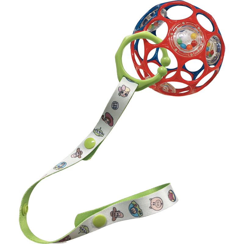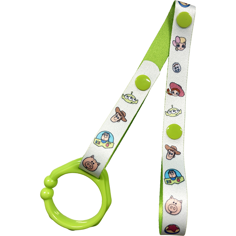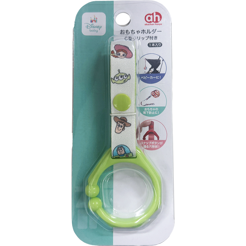 お気に入りのおもちゃの落下防止に! 大切なおもちゃを投げてなくさないようにするホルダーです。 スナップボタンでベビーカーや抱っこ紐などに簡単に取り付けられ、 C型クリップでベビーカーの幌にも取り付けられます。 かわいいトイ・ストーリー柄。