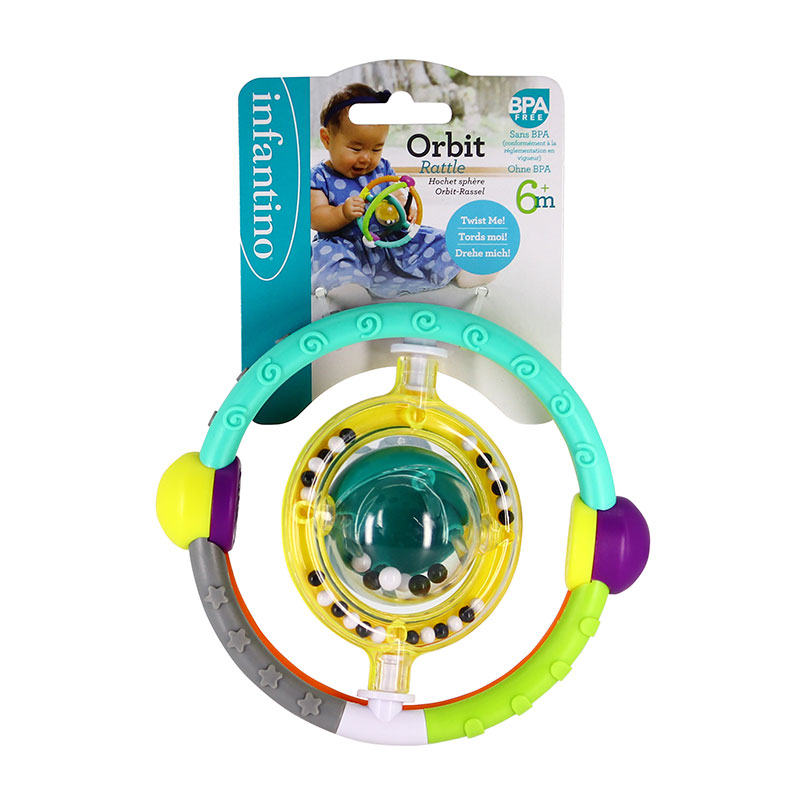 立体的にも平面にもなる変幻自在なラトルです。 リングの重なり合いをを観察することで 「立体」というものを認識することができます。 真ん中の球体型の軌道は、ガラガラと音がなったり、 クルクル回すことができます! 平面だけでなく、立体構造を遊びながら認識でき、 赤ちゃんの興味・好奇心を引き付けます。