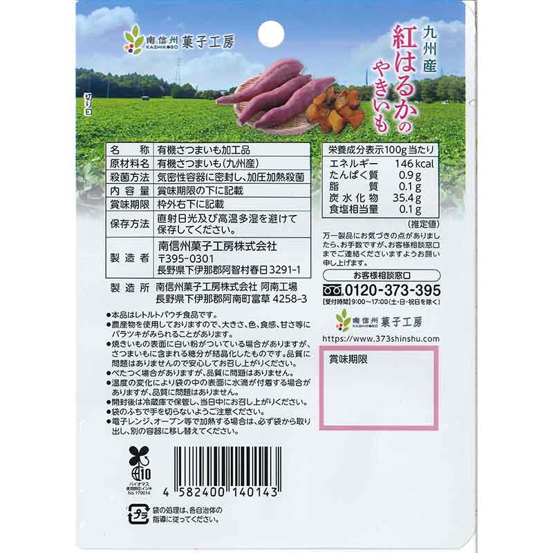 ●有機さつまいも加工品 ●原材料名:有機さつまいも(九州産) ●内容量:賞味期限の下に記載 ●栄養成分:100g当たり 熱量 146kcal たんぱく質 0.9g 脂質 0.1g 炭水化物 35.4g 食塩相当量 0.1g