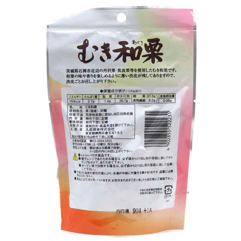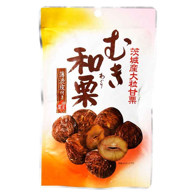 ●むき和栗 ●原材料名:栗(国産)、砂糖 ●内容量:枠外下部に記載 ●栄養成分:100gあたり 熱量 160kcal たんぱく質 2.7g 脂質 1.4g 炭水化物 36.7g 食塩相当量 0.06g 糖質 31.5g 食物繊維 5.2g