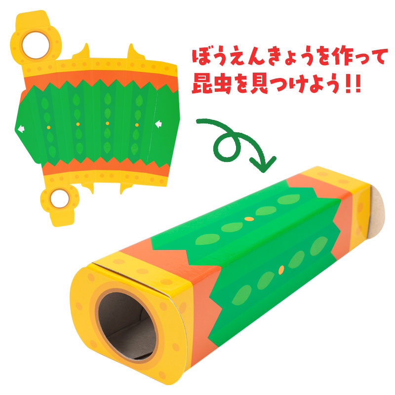 ●対象年齢:3歳~ ●パッケージサイズ(約・mm):横211×奥行7×縦295 ●製品重量:196g ●のぞいて遊ぶ組み立て式望遠鏡(レンズなし)付き ●昆虫シール19種類入り ●昆虫の豆知識付き