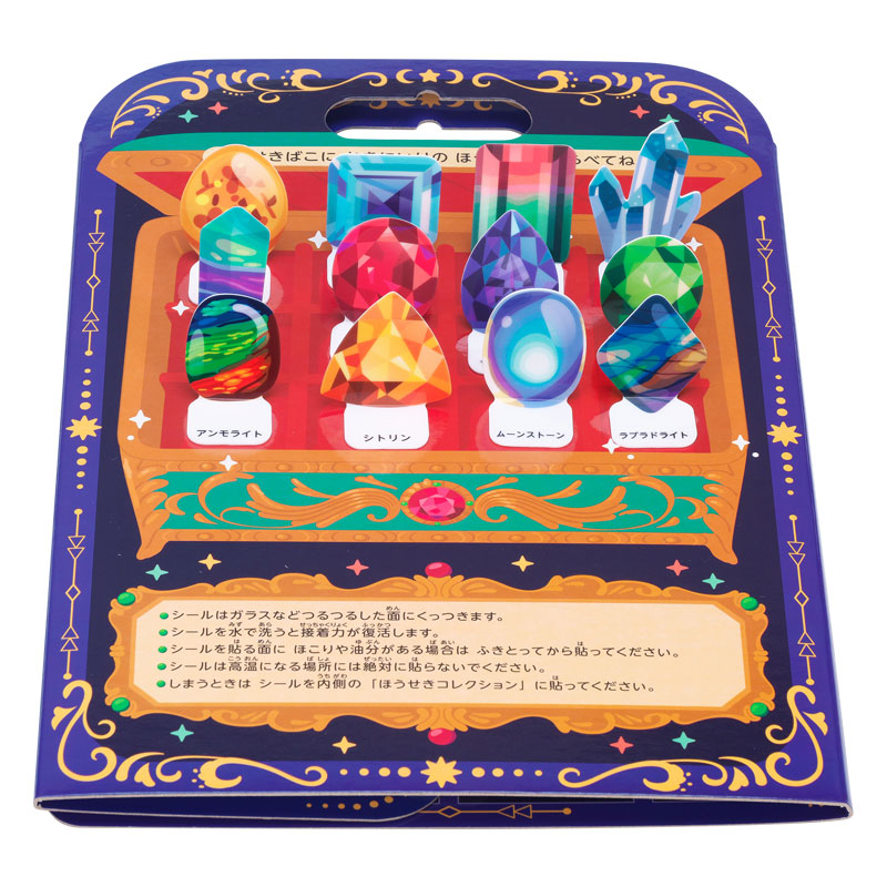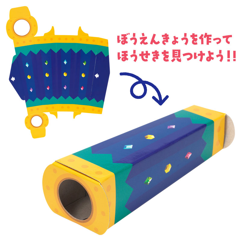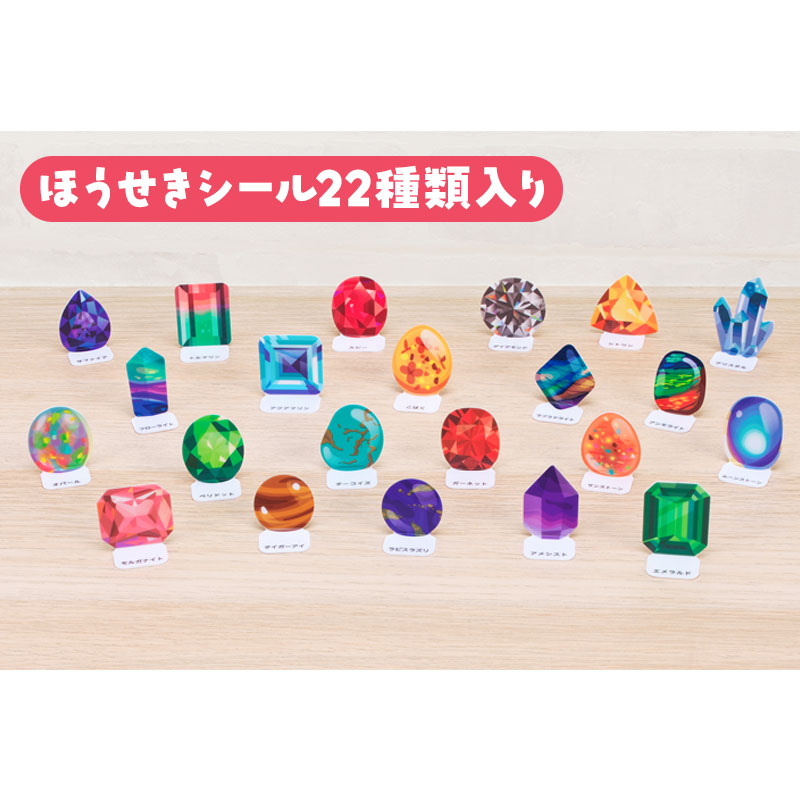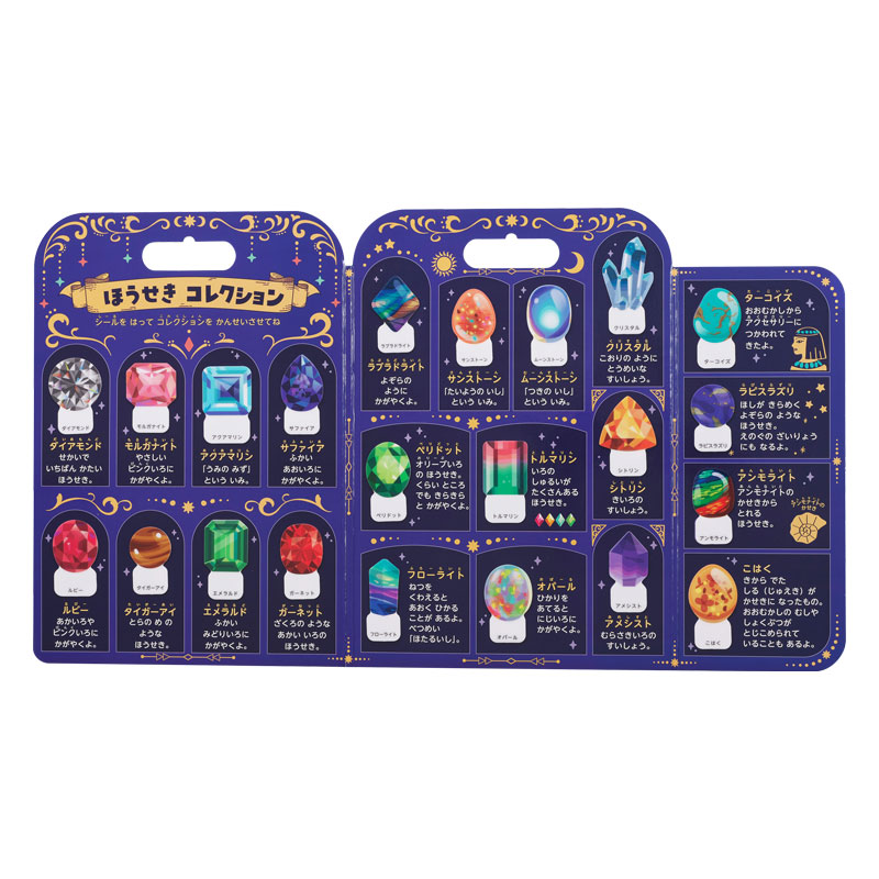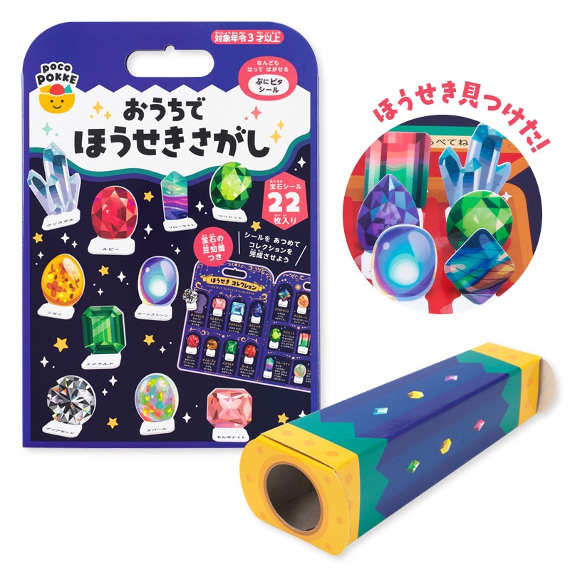 ●対象年齢:3歳~ ●パッケージサイズ(約・mm):横211×奥行7×縦295 ●製品重量:196g ●のぞいて遊ぶ組み立て式望遠鏡(レンズなし)付き ●宝石シール22種類入り ●宝石の豆知識付き