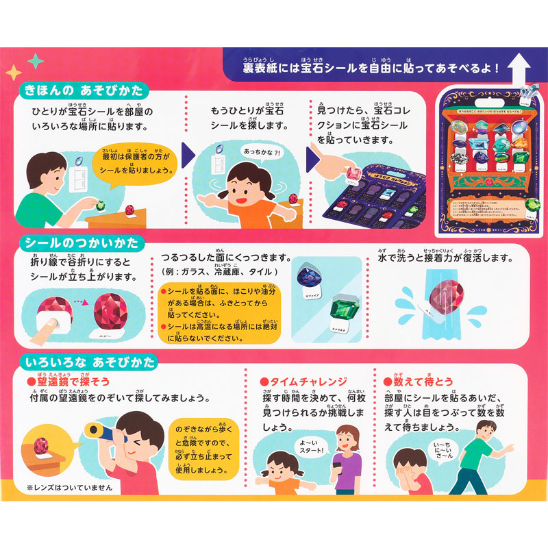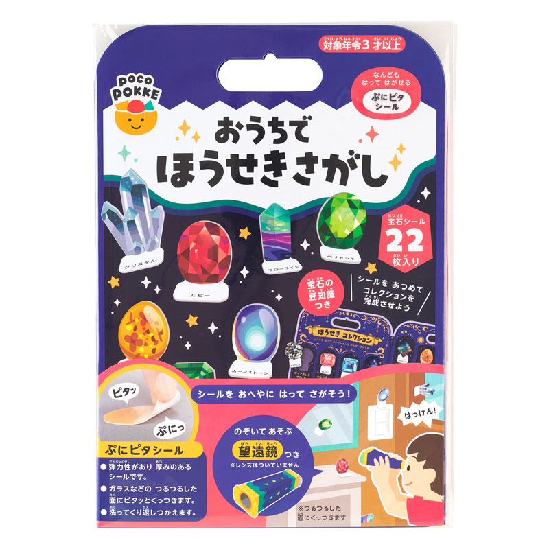 おうちの中でほうせきさがし! おへやのあちこちにシールをはって、宝探しみたいに遊べます。 はってはがせる「ぷにピタシール」。