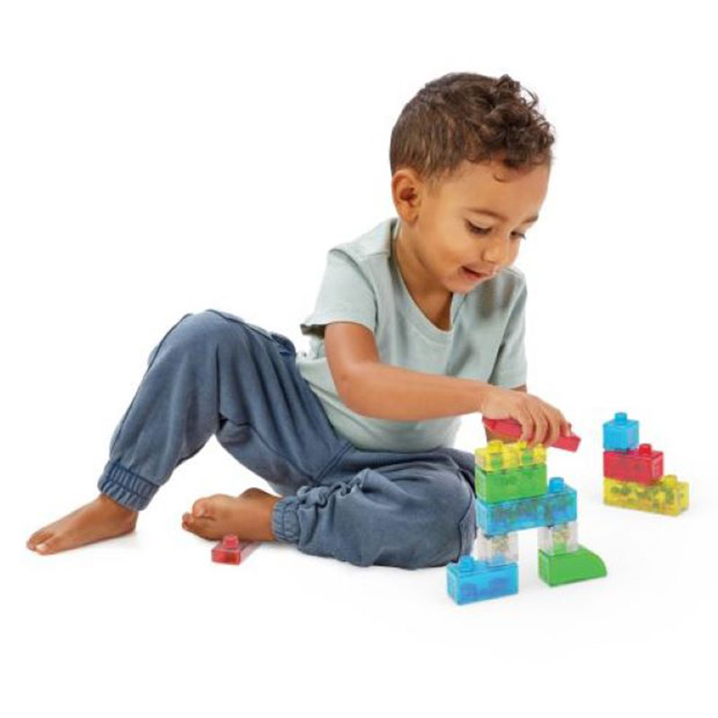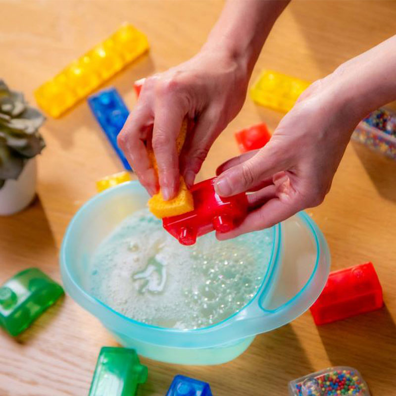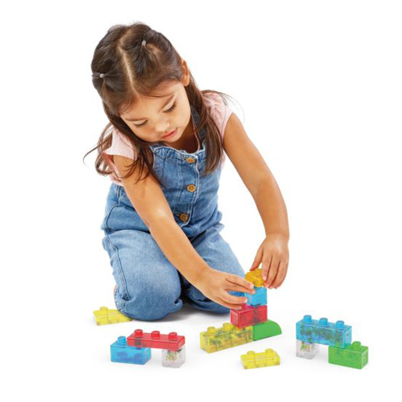 踏んでも痛くない、やわらかブロック。 ブロック遊びをする前のスクイーズとして 握ったり捩じったりして手指の感覚と握力を育てます。 もちろんブロック遊びも可能で、やわらかいから踏んでも痛くないブロック。 透明ブロックの中には砂やビーズなど色々な素材が入っていて、 見た目も楽しくいろいろな感触を楽しむことができます。 ねじったり握ったりすることで握力を鍛え、 指先の運動で脳を活性化させます。11ピース入り。