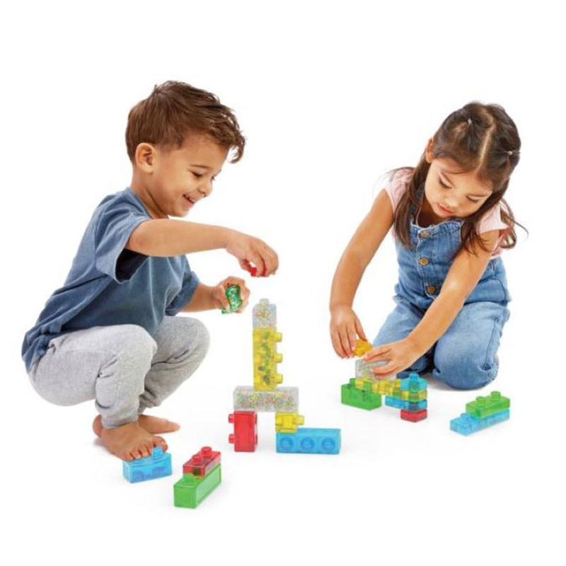 踏んでも痛くない、やわらかブロック。 ブロック遊びをする前のスクイーズとして 握ったり捩じったりして手指の感覚と握力を育てます。 もちろんブロック遊びも可能で、やわらかいから踏んでも痛くないブロック。 透明ブロックの中には砂やビーズなど色々な素材が入っていて、 見た目も楽しくいろいろな感触を楽しむことができます。 ねじったり握ったりすることで握力を鍛え、 指先の運動で脳を活性化させます。