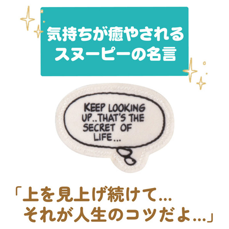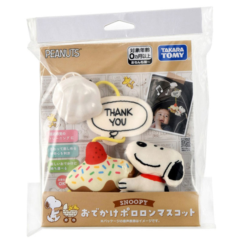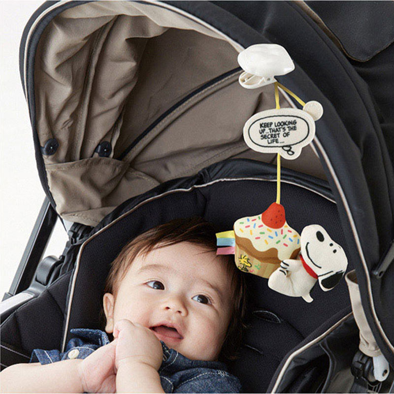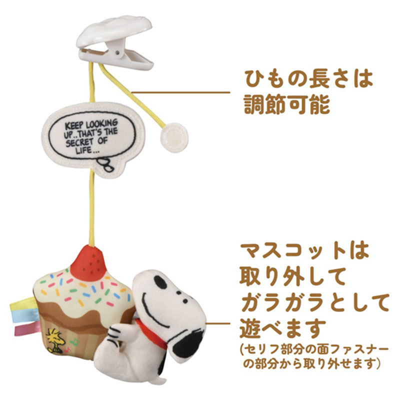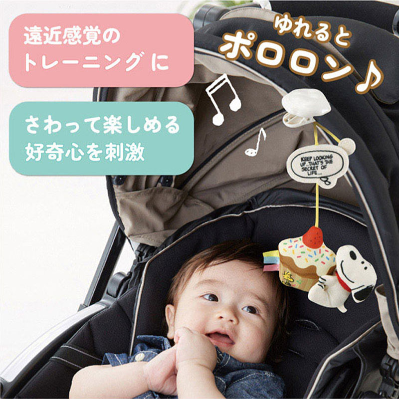 ベビーカーでのおでかけに! ベビーカーフードに付けるスヌーピーのマスコット。 ベビーカーフード(フード前に芯が入った丸幌専用)に付ける、スヌーピーのマスコットです。 揺れるとやさしいチャイム音がします。 フードの前に芯が入ったサンシェードにも取り付け可能。 ・マスコットは簡単に取り外し可能 ・ひもの長さを調節することでマスコットの高さを変更可能 ・気持ちが癒されるスヌーピーの名言が書かれたデザイン ・遠近感覚のトレーニングにもぴったり ・さわって楽しめる好奇心を刺激