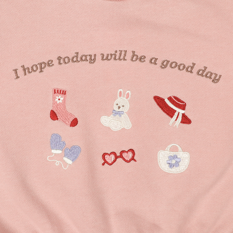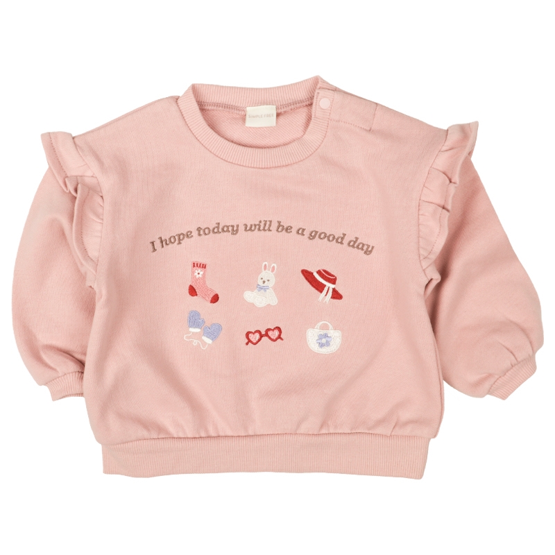 前身のストーリー性のある刺しゅうがアクセントのトレーナーです。袖に控えめなフリルを付けたオシャレなデザイン。全体的にシンプルなデザインで、コーディネイトの巾が広がります。程よい厚みの裏毛素材です。名前が書けるお名前タグ付きです。