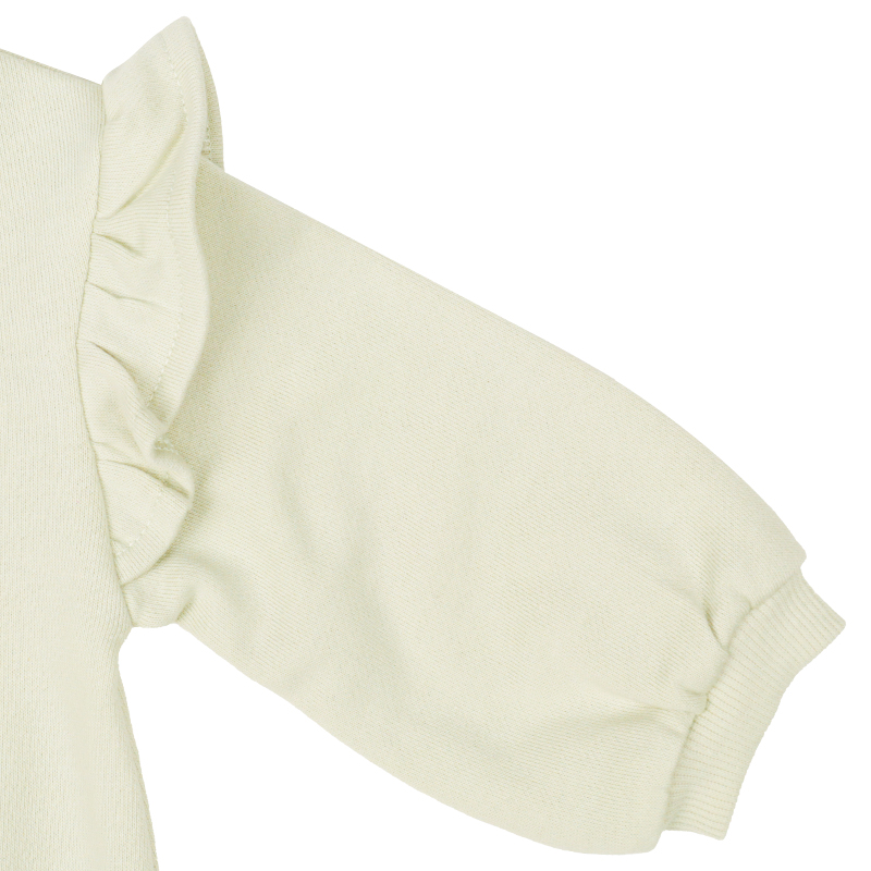 前身のストーリー性のある刺しゅうがアクセントのトレーナーです。袖に控えめなフリルを付けたオシャレなデザイン。全体的にシンプルなデザインで、コーディネイトの巾が広がります。程よい厚みの裏毛素材です。名前が書けるお名前タグ付きです。