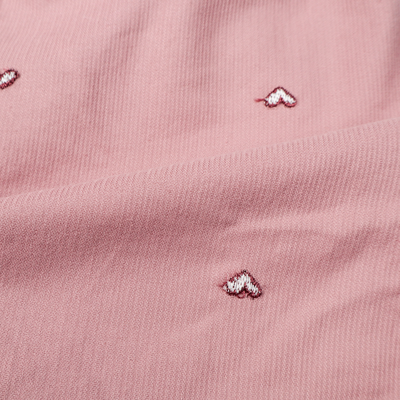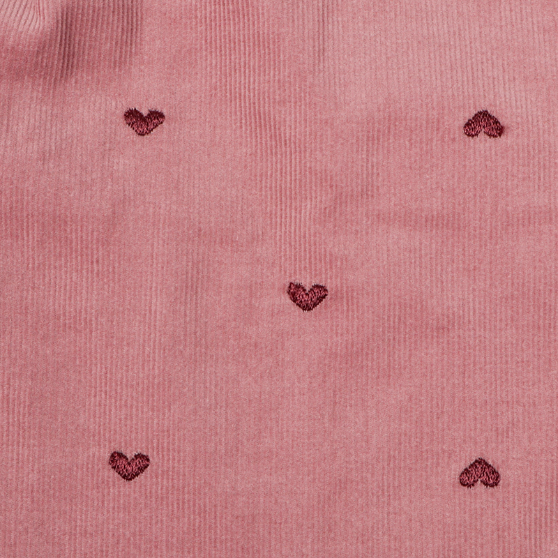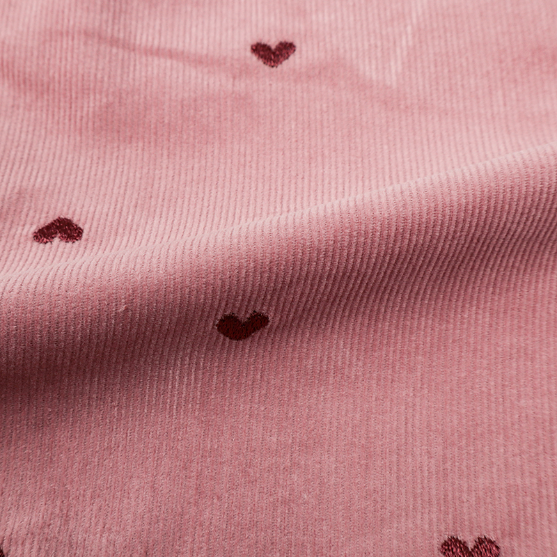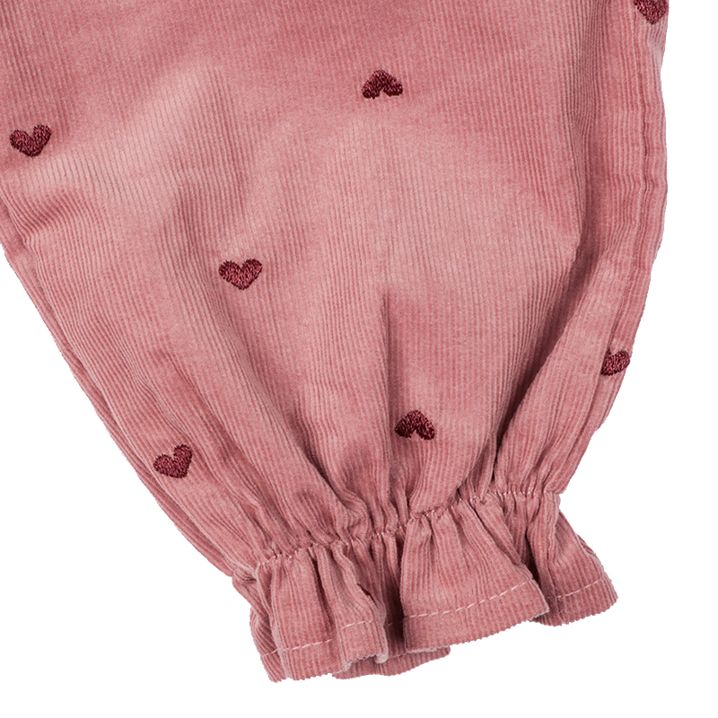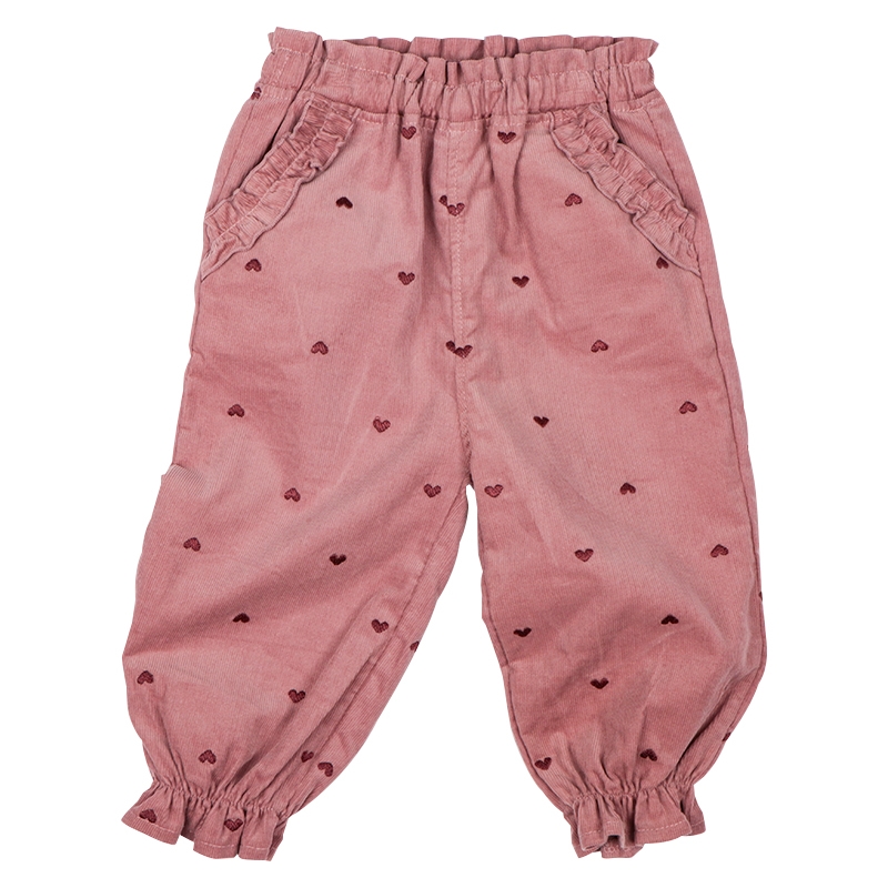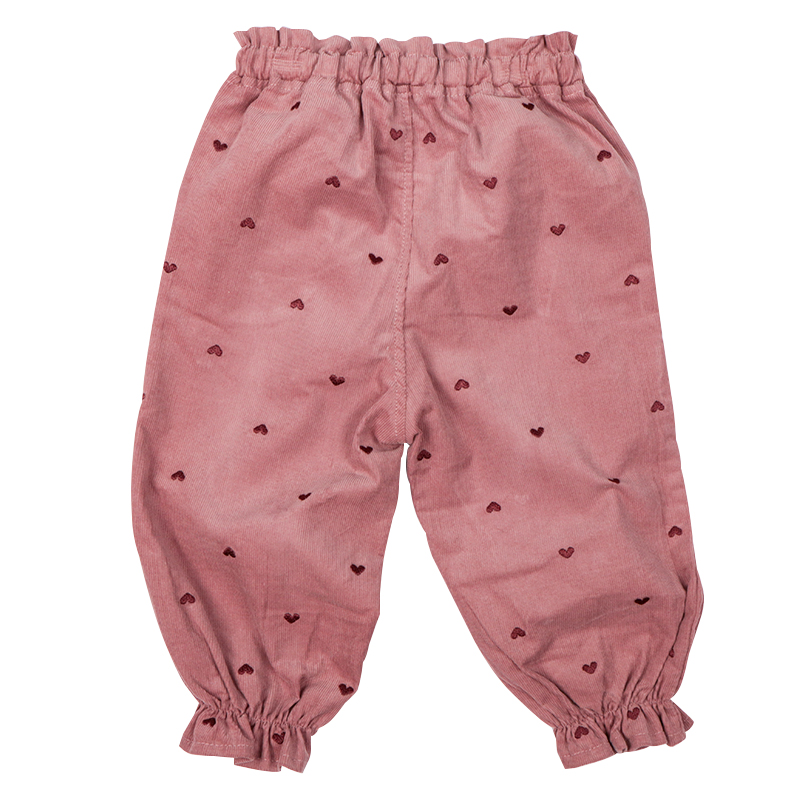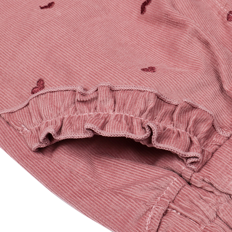 ふっくらシルエットの10分丈パンツです。ハートの総柄刺しゅうで価値観アップ。 ポケット口のフリルもポイントです。はきやすい薄めのコーデュロイ生地を使用しました。 コーディネートのアクセントになるパンツです。名前が書けるお名前タグ付きです。