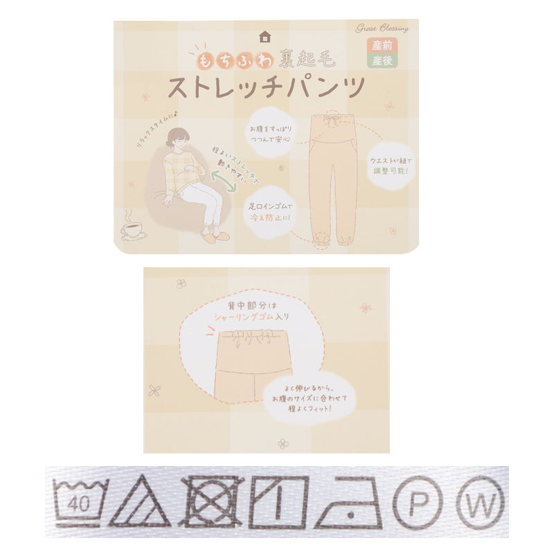 ●素材=〔本体〕ポリエステル95%・ポリウレタン5%(裏起毛) ●サイズ(約・㎝)=M(ウエスト64~70、腹囲81~102) L(ウエスト69~77、腹囲89~110) ※ウエストのサイズは妊娠前のサイズを表示しています。 ●対象期間=産前~産後
