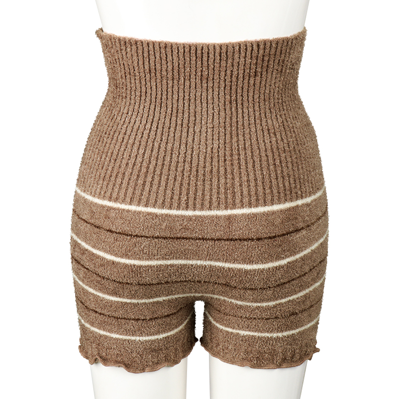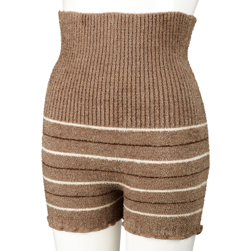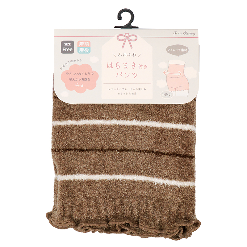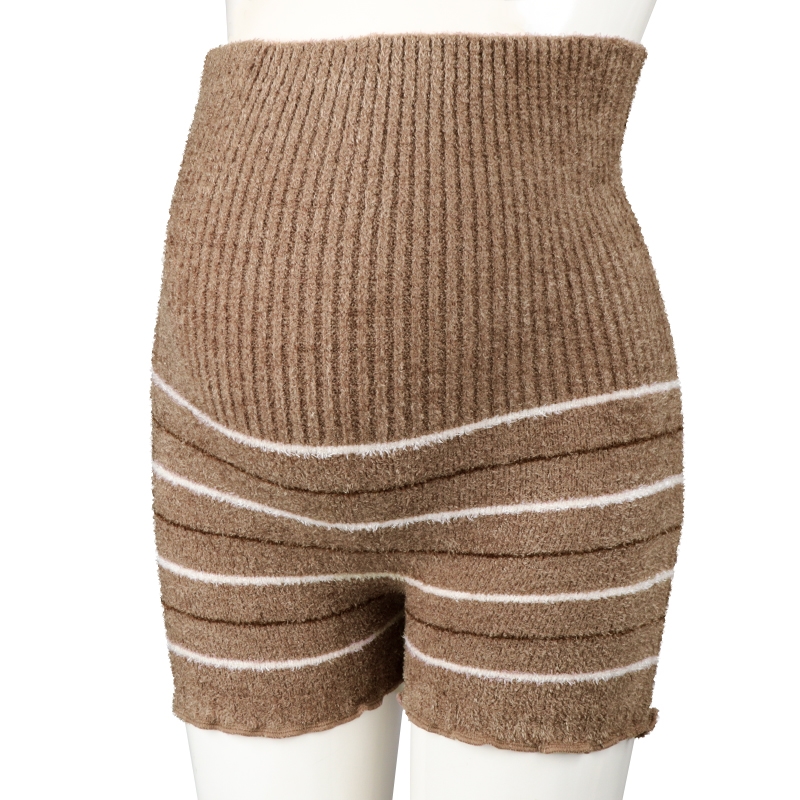 同色ボーダー柄のシンプルデザインの1分丈パンツ。ふわふわ素材でお腹まわりの冷えから守ります。締め付け感のないストレッチ素材でお腹をやさしく包んでくれます。産前から産後まで長く使えるので、寒い冬におすすめです。