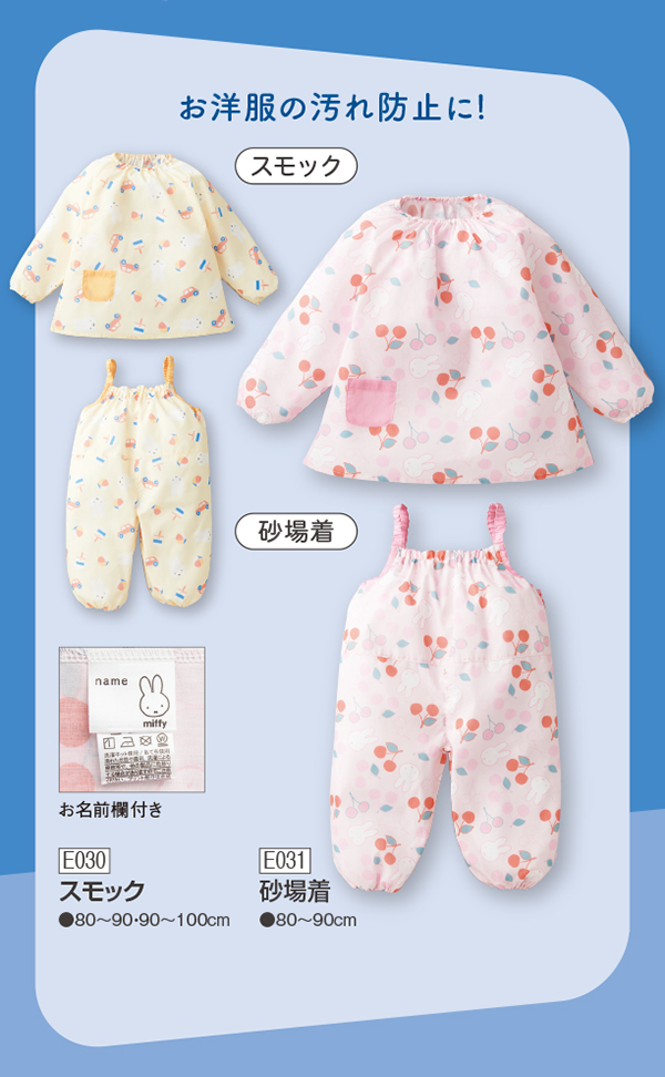 ミッフィーのくるま柄総柄長袖スモックです。 お砂場遊びやお絵かき、お食事など、お洋服を汚したくないときに大活躍の長袖スモック。 首元と袖部分がゴムになっているため、お砂場遊びの時には砂が入りにくいです。 前面には小さいポケットが付いています。